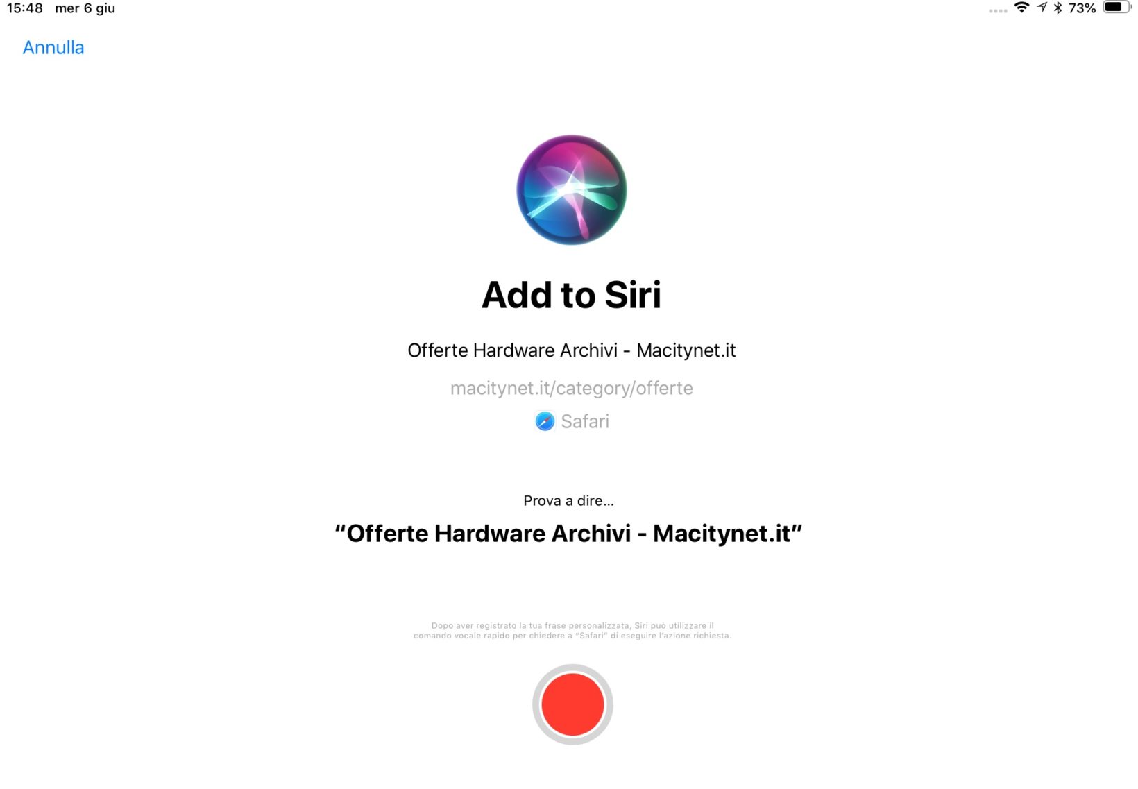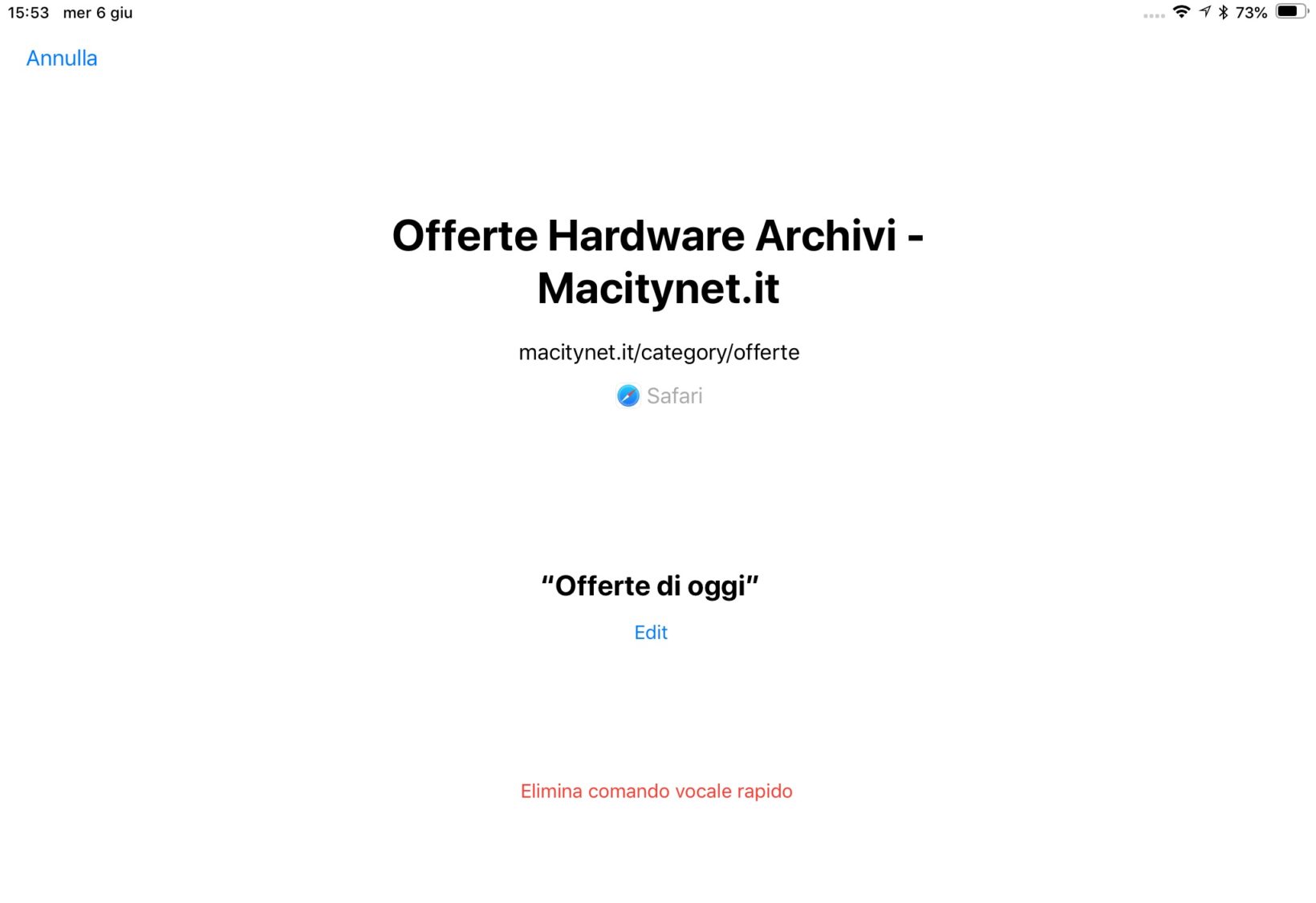 Ad esempio se tutte le mattine andate a vedere la pagina delle offerte hardware di macitynet cliccando su un particolare bottone, iOS 12 vi traccia l’operazione e vi suggerisce un comando vocale adeguato che potete personalizzare ad esempio con “offerte di oggi”: con questo semplice comando si aprirà il sito macitynet.it e sarà attivata la pagina delle offerte che potrete vedere immediatamente dopo il comando vocale.