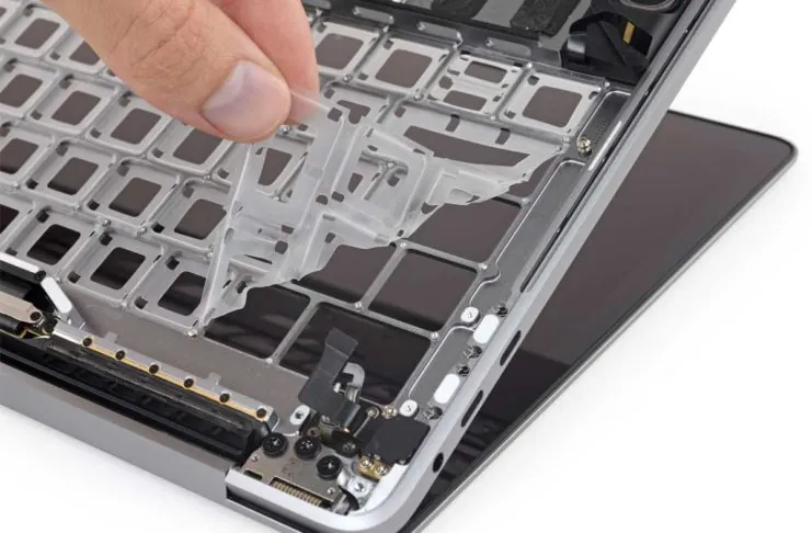 iFixit ha completamente smontato la tastiera strato dopo strato, con ovvie difficoltà per via delle colle utilizzate e che spiega perché i Centri di Assistenza cambiano tutto il top case in caso di problemi alla tastiera. Da notare che la barriera in silicone è ottenuta da fogli modellati partendo da una fustella forgiata in modo da eseguire un taglio unico.