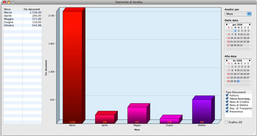 Tutti i principali documenti di vendita sono supportati, ricordiamo DDT, preventivi, fatture, fatture accompagnatorie, note di credito e debito. Tra le altre funzioni offerte ricordiamo lo scadenziario pagamenti dei clienti, l’inclusione in fattura dei DDT e dei preventivi emessi in precedenza, la possibilità di inviare la fattura via email come allegato PDF, infine la possibilità di ottenere automaticamente statistiche sui dati di vendita.