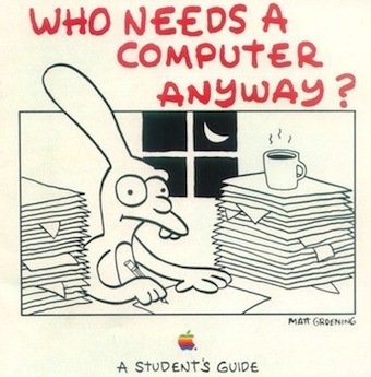 La storia che racconta Heisler parte da lontano: sin da quando, negli anni ’80 Groening non aveva ancora partorito la famiglia gialla e si dedicava alle strisce a fumetti Life in Hell, con protagonisti un gruppo di conigli dalle fattezze (e dai difetti) del tutto umani. Questi personaggi sono gli stessi che fanno da guida ad un manuale d’uso del Mac indirizzato agli studenti dal titolo “Comunque, chi ha bisogno di un computer?”.