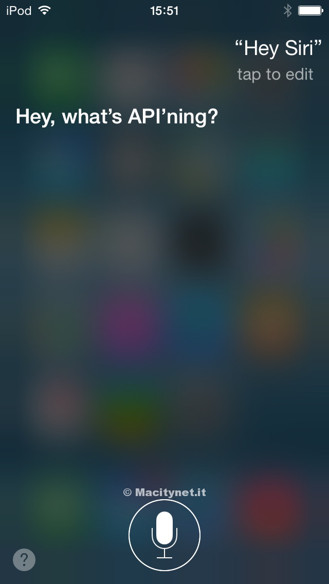 Siri fa battute agli sviluppatori che stanno testando la nuova beta di iOS 8. Basta semplicemente salutare l’assistente vocale di Apple per ricevere occasionalmente una risposta che ironizza su qualche novità introdotta dal nuovo sistema. Da segnalare che le battute sono localizzate; ad esempio in Italiano si gioca sul termine API, con riferimento allo stordimento prodotto dal codice paragonato a quello dell’insetto che ci ronza nelle orecchie; in lingua inglese vengono inserite nell’assonanza “What’s API’ning?” (Hey, What’s happening?, che succede?).