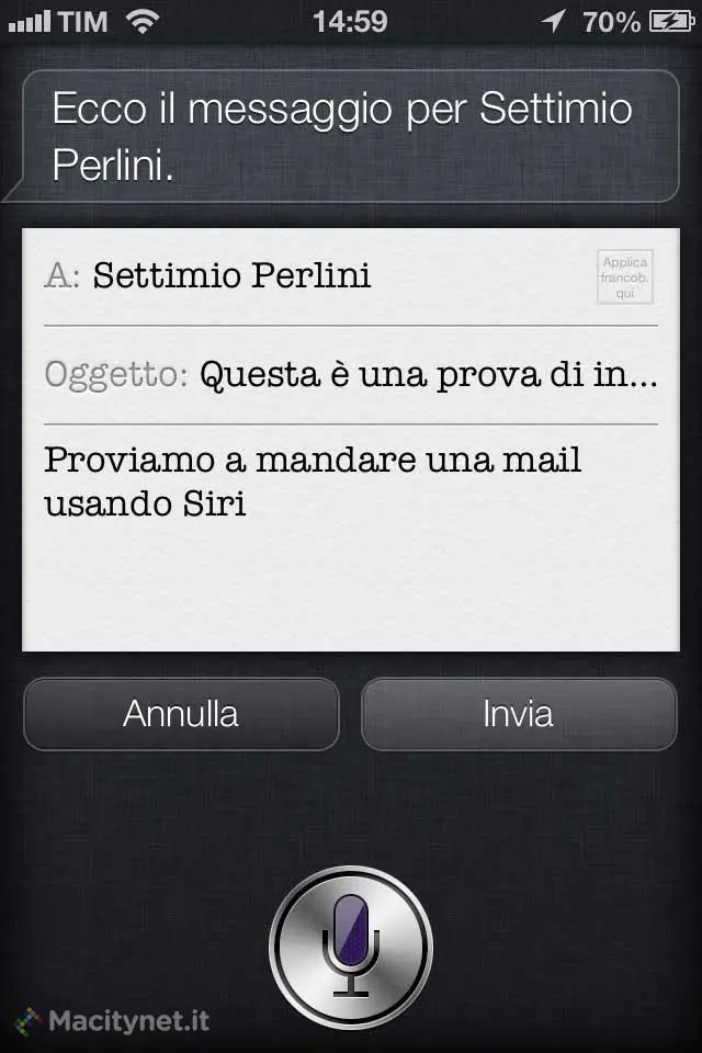 Quando smettiamo di parlare, Siri visualizza il testo corrispondente a quanto è stato pronunciato e dà una risposta. Se l’assistente ha bisogno di più informazioni per completare una richiesta, farà una domanda. Per esempio, se diciamo “Ricordami di telefonare alla mamma”, Siri chiederà: “Quando devo ricordarti il promemoria?”.