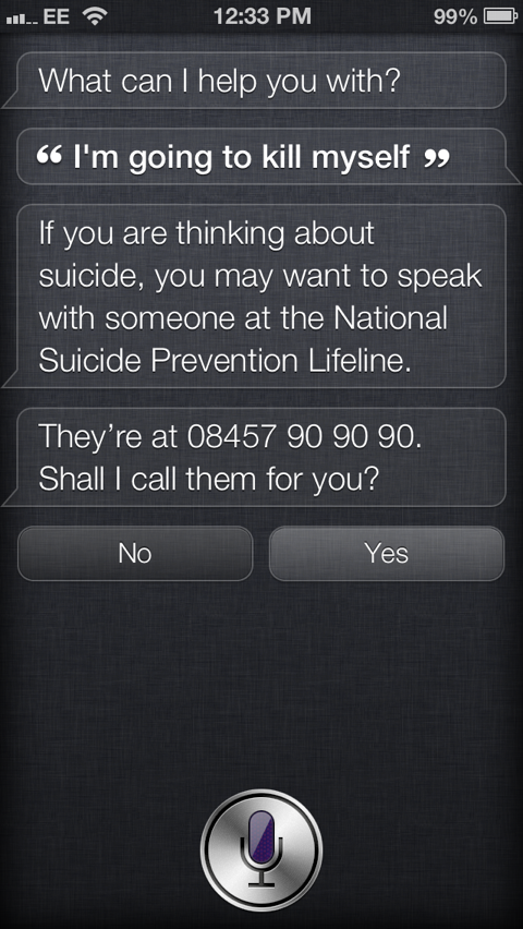 Siri non è ancora un vero e proprio assistente sociale, né è in grado di svolgere una terapia psicologica ma, almeno nella sua versione USA americana, si presta per indirizzare le persone verso chi può dare una mano in termini di supporto e conforto. Quel che i programmatori Apple hanno previsto in questa direzione si manifesta quando qualcuno prova a dire a Siri che ha intenzione di suicidarsi.
