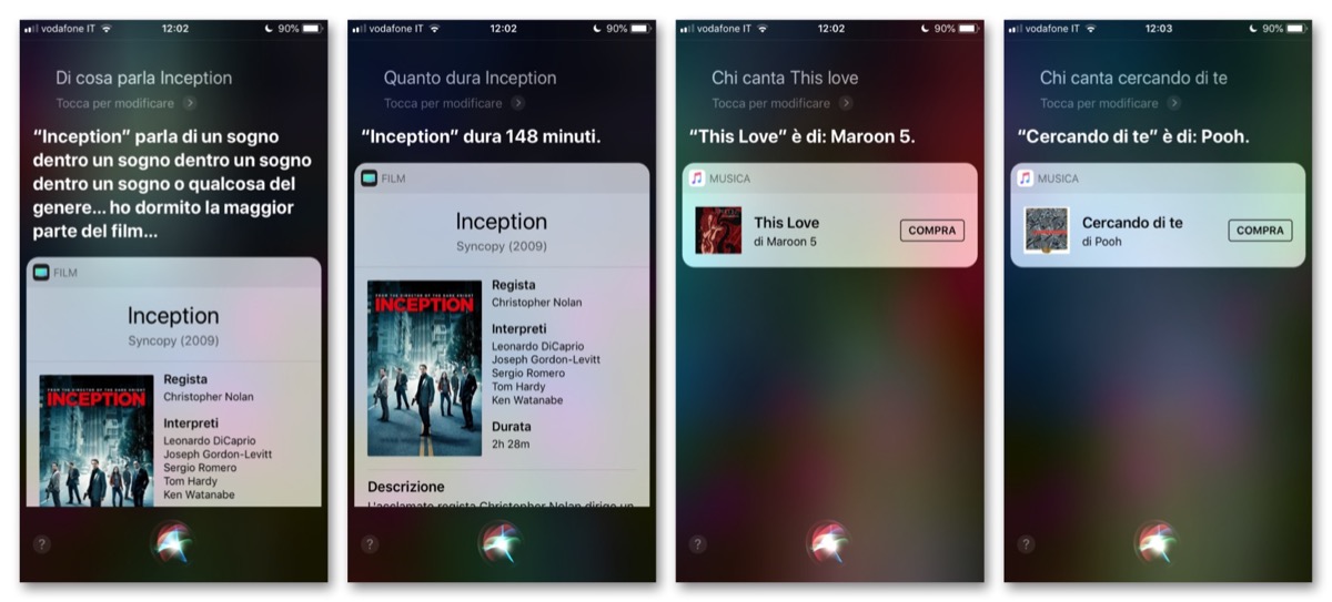 Siri è ovviamente anche appassionata di cinema tanto da essere stata ispiratrice del film “lei”. E’ possibile chiedere “Che attori ci sono nel film Inception”, “Quanto dura Inception”, “Chi ha diretto Inception” ma anche domande più complesse come “Di cosa parla Inception” e ricevere risposte tutt’altro che scontate…