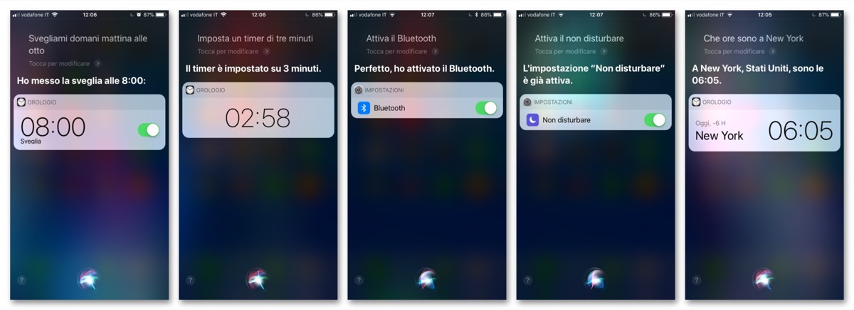 È possibile chiedere a Siri che ore sono (“Che ore sono?”) ma anche specificare la città. Esempio: “Che ore sono a New York?”, “Che ore sono a Pechino?”, ma anche “Fuso Orario Australia”.