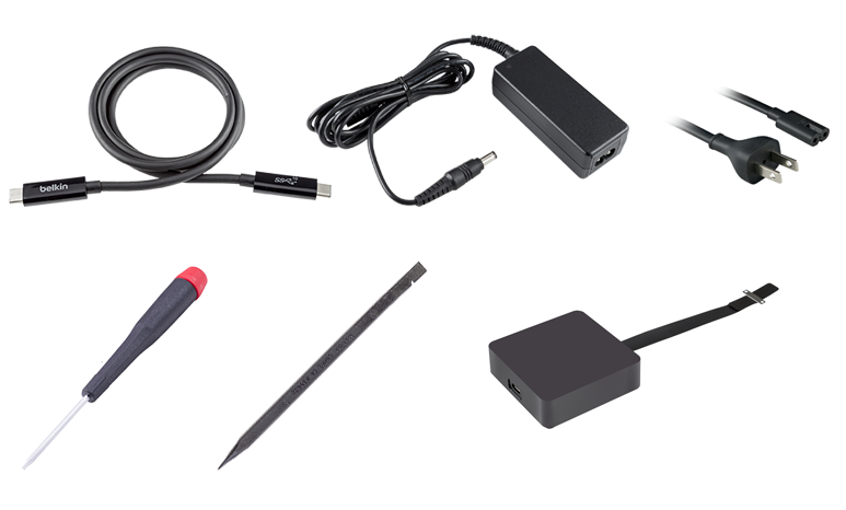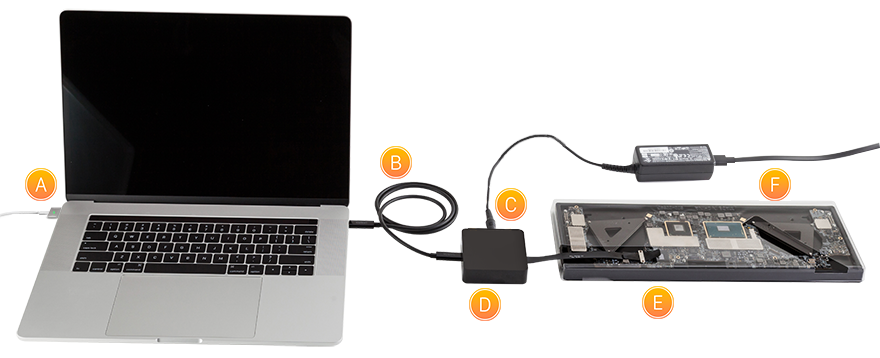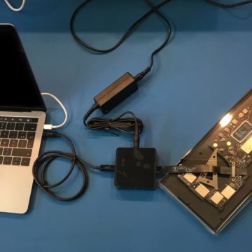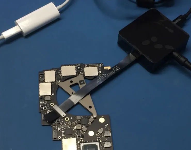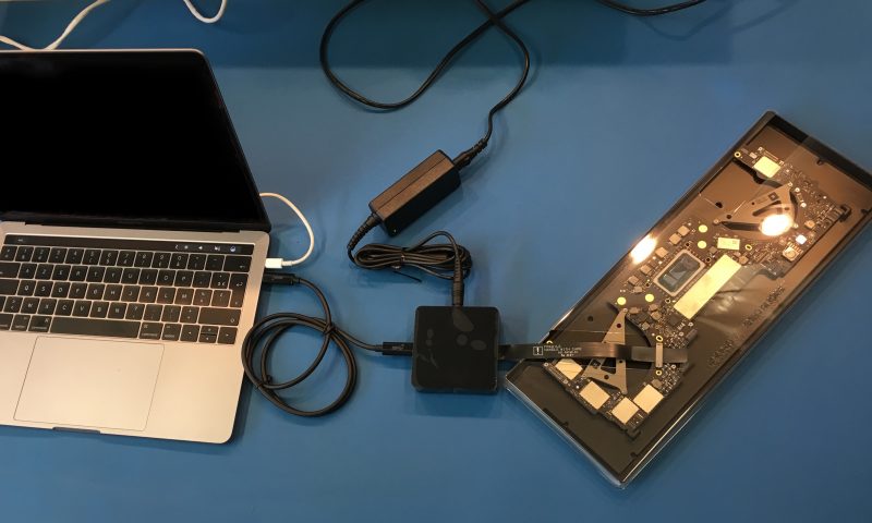 Nei centri autorizzati, il personale di Apple ha a disposizione accessori dedicati che possiamo osservare nelle foto allegate. Il kit consiste in uno scatolotto da collegare alla scheda logica, un cacciavite, un alimentatore e un cavo Thunderbolt 3 progettato da Belkin.