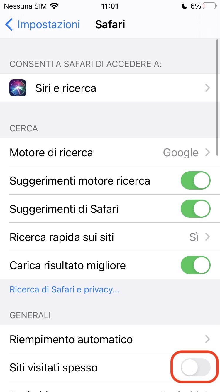 Per quanto riguarda iPhone e iPad, è necessario aprire l’app “Impostazioni”, quindi cliccare sulla scheda denominata “Safari” e spegnere l’interruttore (se acceso) alla voce “Siti visitati spesso”.