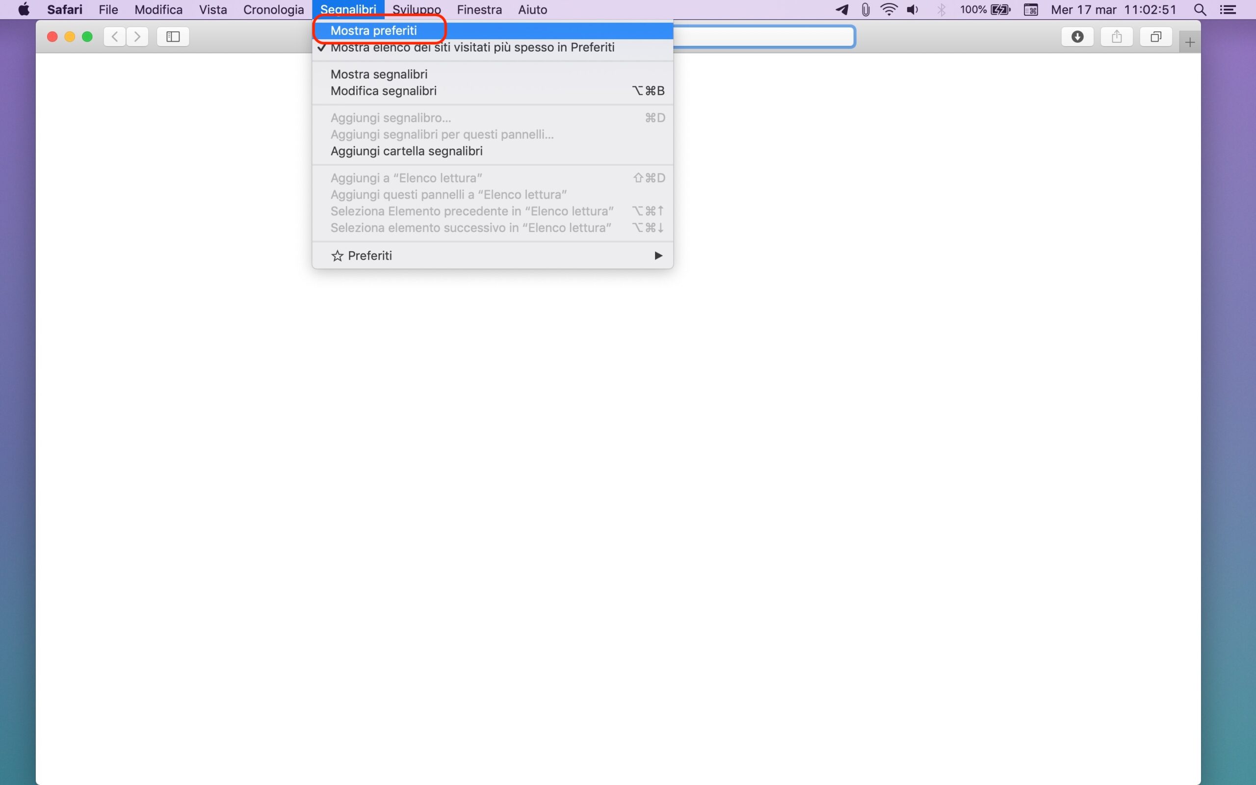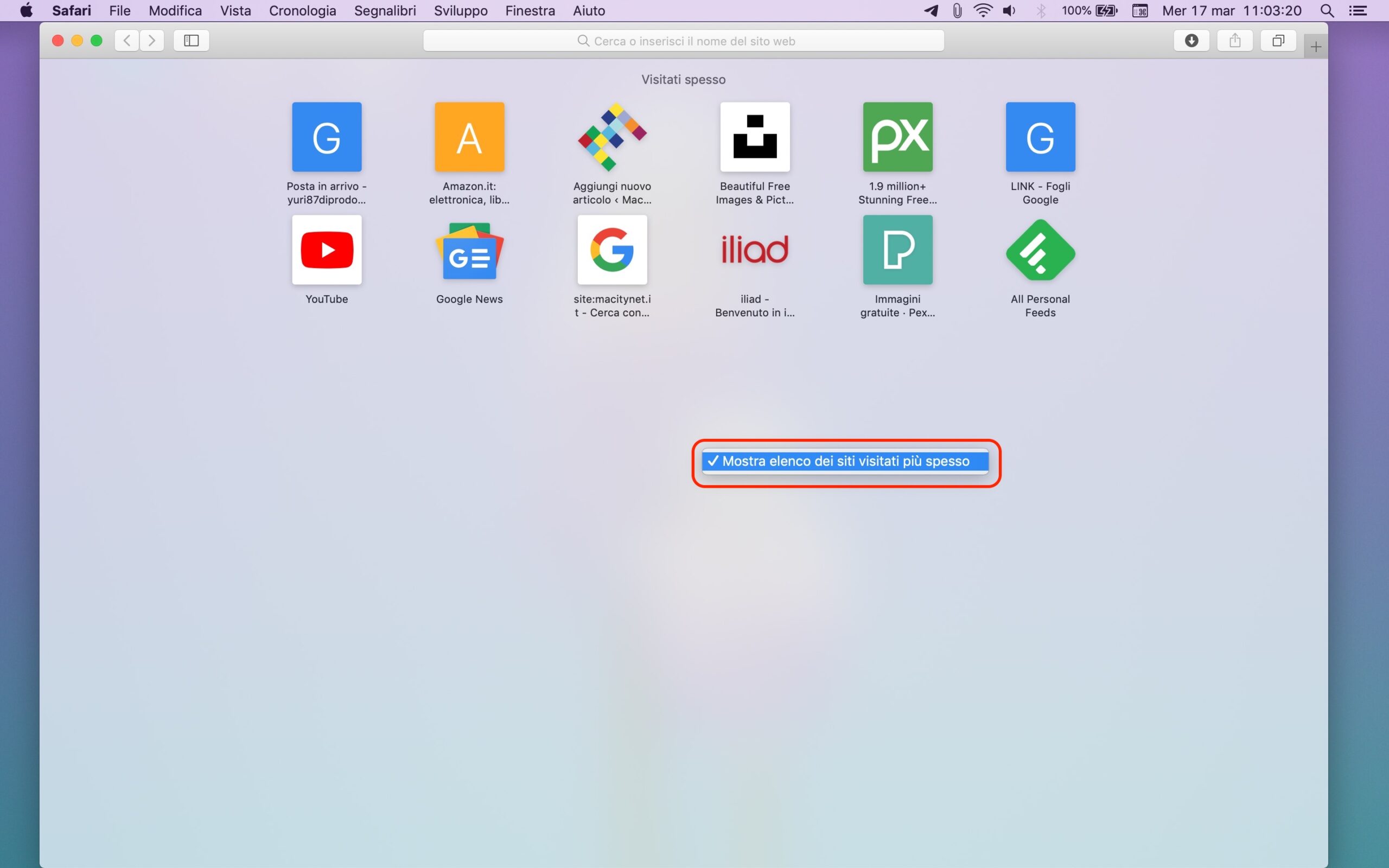 Su Mac invece è sufficiente aprire l’app “Safari” oppure, se è già aperta, aprire una nuova scheda dal menu “File > Nuova scheda” oppure con la combinazione di tasti “Command + N”. A questo punto bisogna cliccare sulla barra dei menu alla voce “Segnalibri”, quindi selezionare l’opzione “Mostra preferiti”, quindi posizionare il cursore del mouse in un qualsiasi punto vuoto della finestra o tra una icona e l’altra, cliccare con il tasto destro e togliere la spunta alla voce “Mostra elenco dei siti visitati più spesso”.