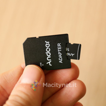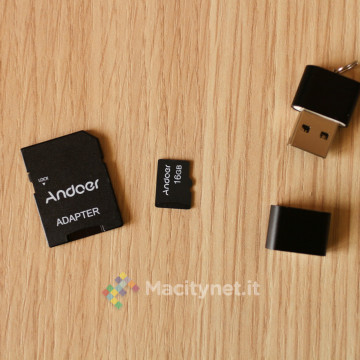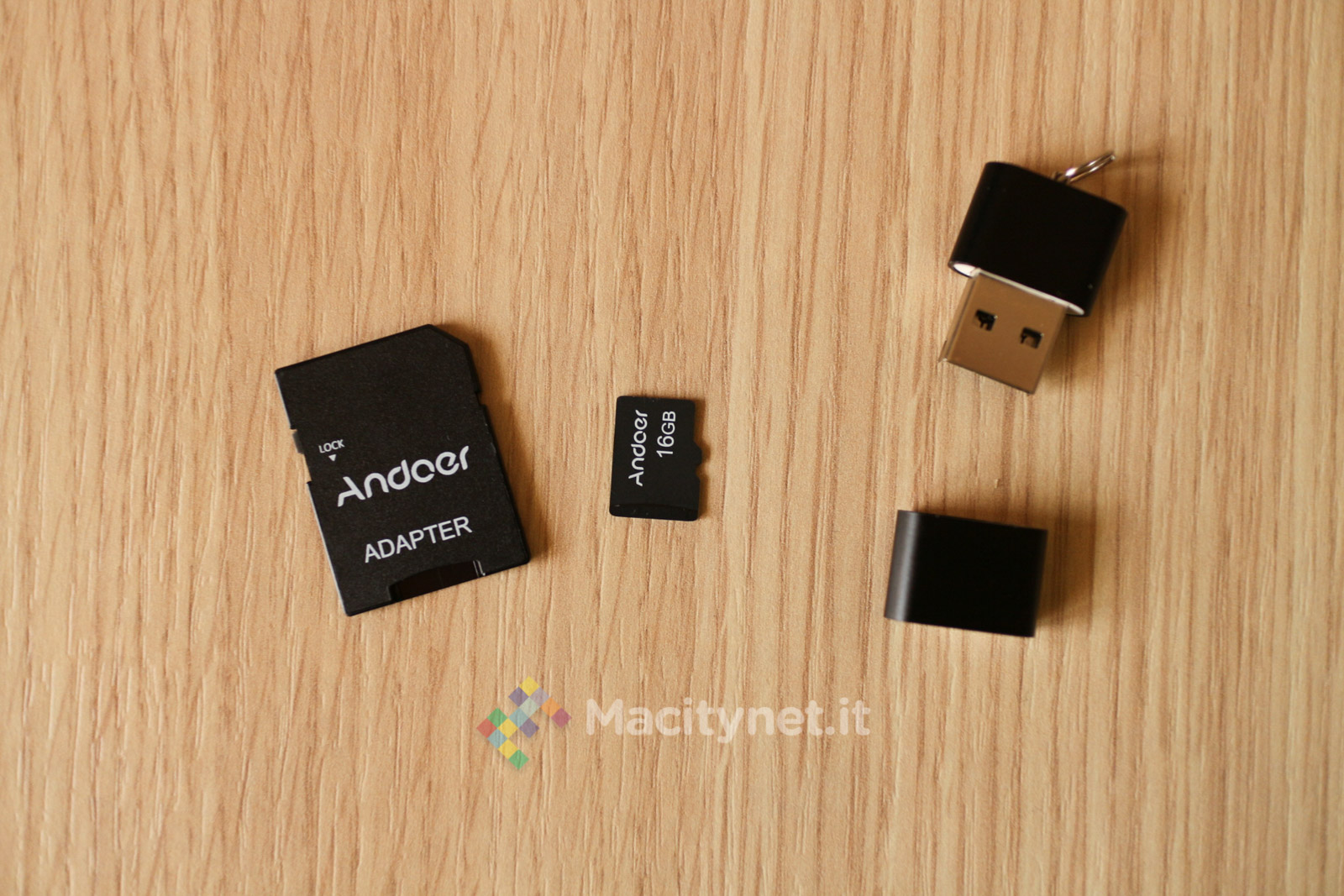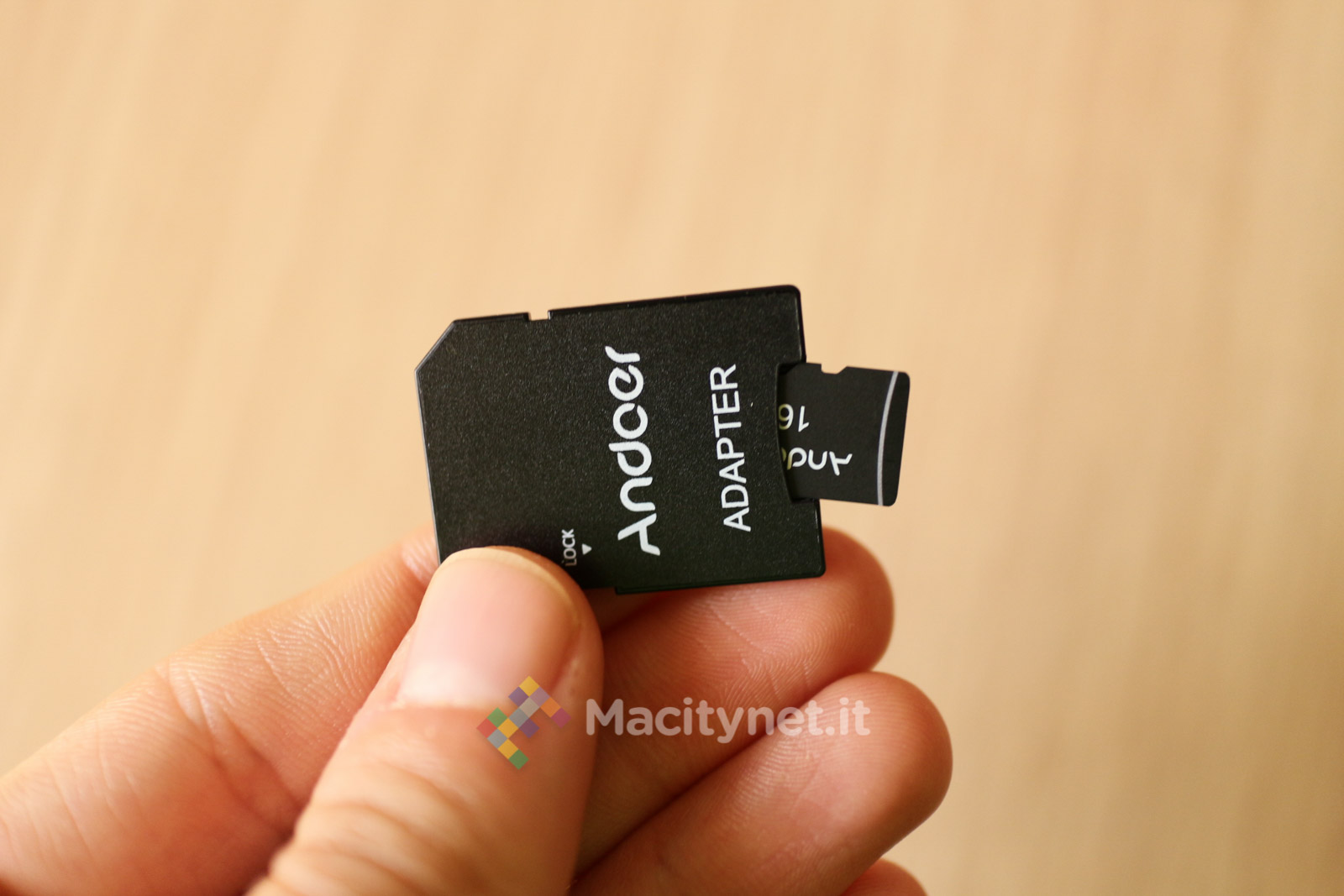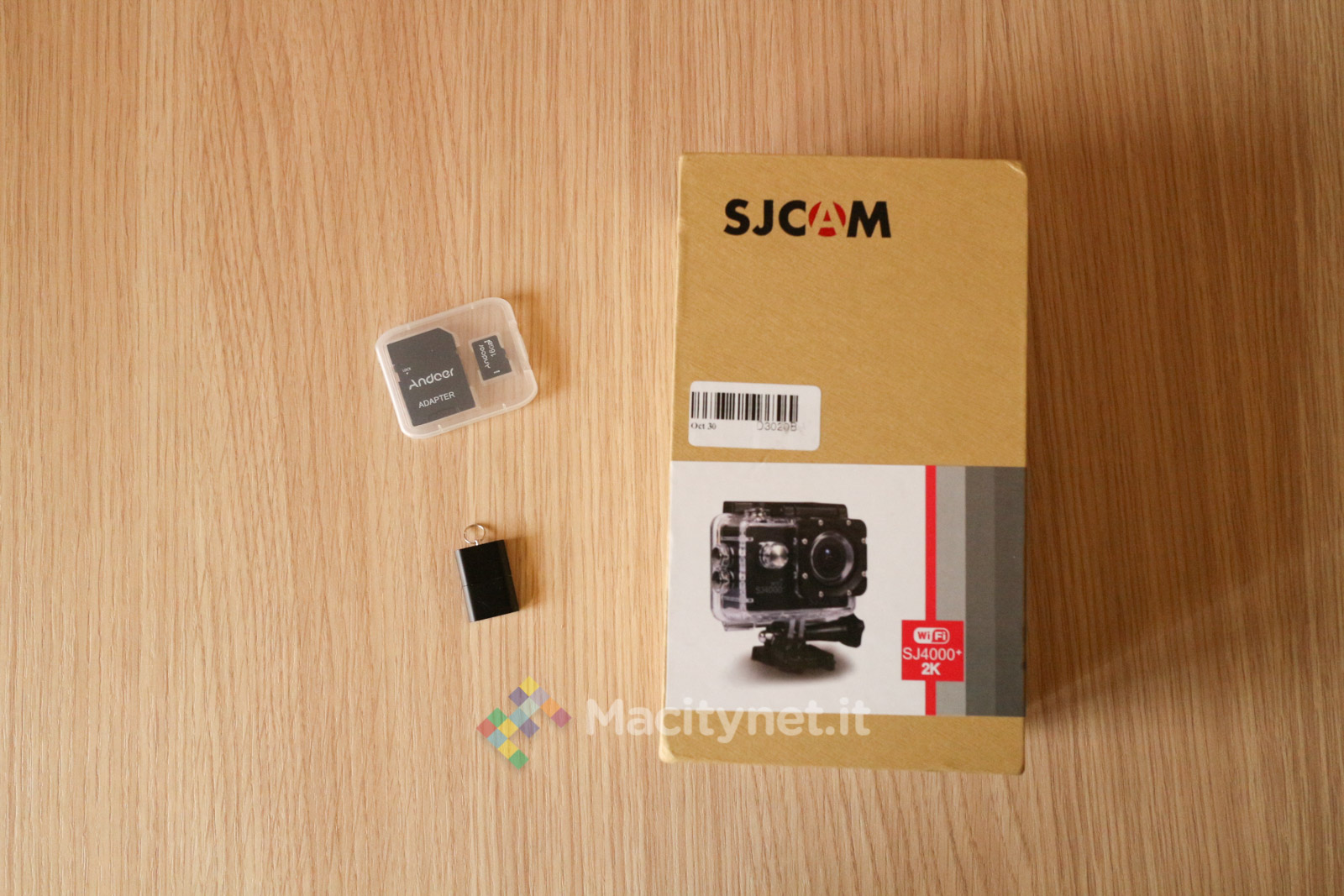 Con l’acquisto della SJCAM SJ4000+ o della SJCAM M10+ è inclusa, in una bustina separata, una microSD da 16 GB corredata da due adattatori per poter collegare la schedina ad un qualsiasi computer e scaricare i dati tramite SD o USB.