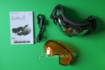 La maschera viene venduta all’interno di una confezione da esposizione illustrata, con un ampia apertura trasparente che permette di dare uno sguardo al prodotto anche prima di aprire la scatola. All’interno, insieme al manuale delle istruzioni in italiano ed inglese, troviamo il cavo miniUSB per la ricarica, gli occhiali con la mascherina a specchio già montata, ed una arancio-trasparente da cambiare all’occorrenza.