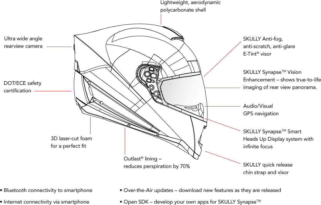 Il casco AR-1 di Skully è costruito sfruttando la piattaforma denominata Skully Synapse che collega l’head up display (HUD) ad una rete intelligente che include telecamera, sensori e microprocessori. AR-1 presenta un sistema HUD che mostra ad una distanza percettiva di circa 3.3 metri di fronte al motociclista, una telecamera con vista verso dietro a 180 gradi, navigazione GPS sterzata per sterzata, in coppia con lo smartphone e controllo vocale.