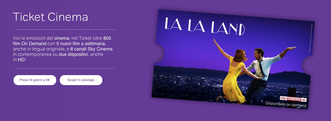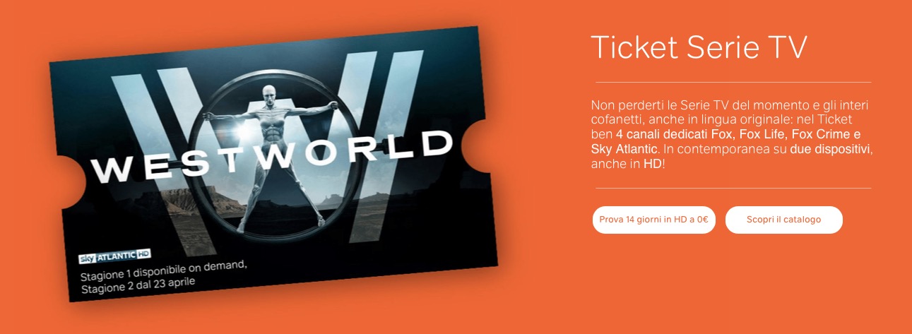 Con il ticket Serie TV è possibile invece guardare i canali Fox Life, Fox Crime, Sky Atlantic, Fox Life HD, Sky Atlantic HD, Fox Crime HDm Fox Channel HD. Anche in questo caso, naturalmente, sono presenti le Serie TV on demand da guardare in qualsiasi momento.