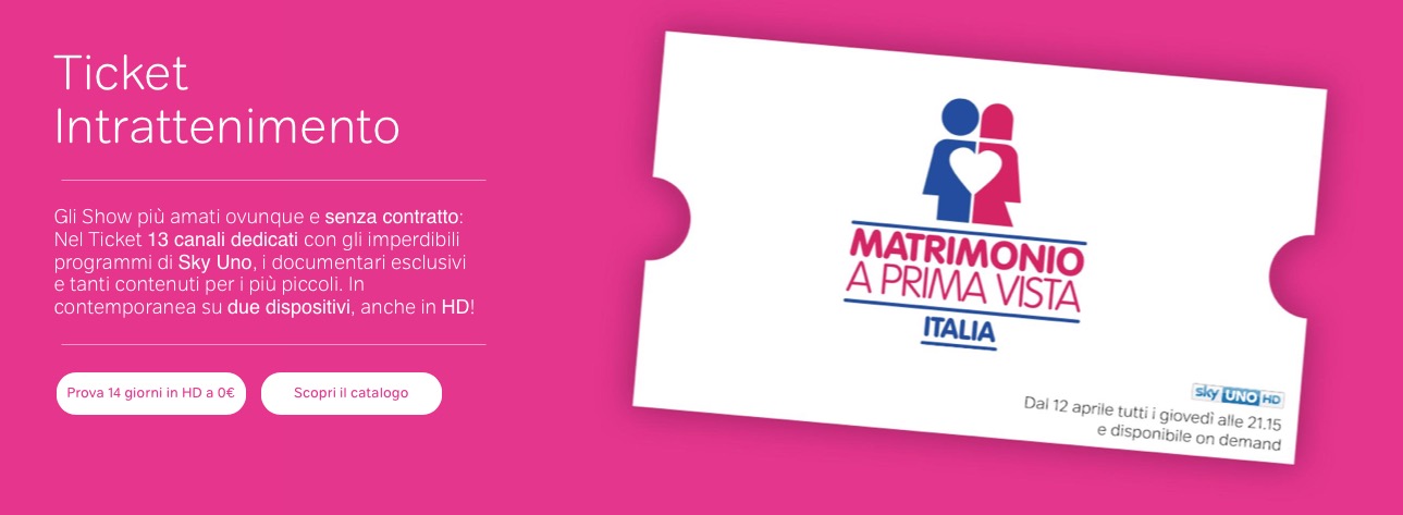 Il ticket intrattenimento, invece, offre l’accesso ai canali Sky TG24, Fox Life, Disney Channel, Sky Uno, Disney Junior, Sky Sport24, MTV, Nick Junior, Eurosport, Nat Geo Wild, Eurosport 2, History Channel, Fox Animation, Nat Geo Wild HD, Disney Channel HD, Eurosport HD, MTV HD, Fox Life HD, Sky Uno HD, Eurosport 2 HD, History HD, Sky Sport 24 HD, Fox Animation HD e Sky TG24 HD. anche in questo caso sarà possibile guardare on demand gli spettacoli mandati in onda su questi canali.
