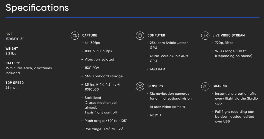Il drone sarà in grado di volare e registrare immagini per circa 16 minuti, prima di dover sostituire la batteria. Inoltre, gli stessi produttori fanno notare che in alcune circostanze il drone potrebbe faticare a riconoscere ostacoli, come fili elettrici sottili o piccoli rami. Anche le superfici in vetro o una folla di persone potrebbero essere pericoli invisibili al drone. Questo perché l’identificazione dell’ostacolo dipende dal colore del soggetto, da quello dello sfondo e dalla velocità a cui vola il drone. Inoltre, oggetti in movimento, come una palla o un frisbee, sono difficili da rilevare per il drone, che ovviamente non ne può anticipare i movimenti.
