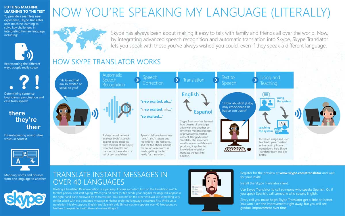 Skype Translator supporterà inizialmente soltanto due lingue, Inglese e Spagnolo, e sarà disponibile sui dispositivi che utilizzano Windows 8.1, ma più di quaranta lingue saranno a disposizione per gli utenti. Skype Translator si basa su un sistema di apprendimento automatico, che rende il programma più “intelligente” dopo ogni utilizzo. Translator sarà presto disponibile in lingua italiana: è già possibile preregistrarsi al servizio compilando il modulo che si trova a questa pagina.