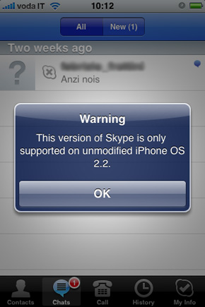 La nuova versione di Skype 1.0.2 disponibile da alcuni giorni non funziona con iPhone e touch sottoposti a jailbreak. Una volta lanciato l’applicativo appare un avviso che informa che Skype può funzionare esclusivamente sui dispostivi con sistema operativo 2.2 non modificato.
