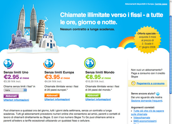 Tutte le nuove offerte sono consultabili in questa pagina del sito Skype italiano. In occasione del lancio Skype propone l’acquisto di tre mesi di abbonamento flat al prezzo di 2, con validità fino al primo giugno 2008.