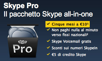 “Con Skype Pro semplifichiamo l’acquisto dei nostri prodotti a pagamento per le comunicazioni dei nostri 171 milioni di utenti registrati. Skype Pro permette di chiamare utenze fisse e mobili in tutto il mondo a costi straordinariamente competitivi,” dichiara Stefan Oberg, General Manager Telecoms di Skype. “La combinazione tra i servizi Skype gratuiti e Skype Pro è veramente fenomenale. Insieme alle chiamate a zero Euro al minuto, Skype Pro integra Skype Voicemail gratuita, un concreto sconto sulla numerazione SkypeIn e sui dispositivi hardware Skype, nonché 5 euro di credito prepagato per chiamate SkypeOut quando si rinnova l’abbonamento per cinque mesi. In sintesi, Skype Pro è una modalità semplice e conveniente per tenersi in contatto con altre persone in tutto il mondo”.