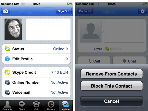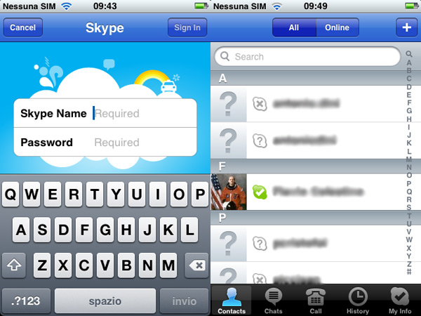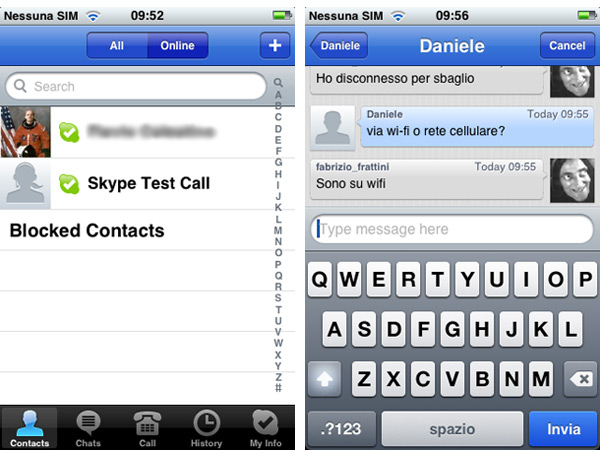 Pur essendo alla prima versione, più precisamente 1.0.1, il programma offre una interfaccia chiara, dalla grafica elegante e funzionale, anche se non mancano alcuni dettagli importanti da sistemare. Mentre nelle prime prove effettuate non abbiamo riscontrato problemi particolari con iPhone 3G, l’applicativo si è bloccato diverse volte utilizzandolo sulla prima versione di iPhone Edge. Anche se questo modello non è mai stato importato ufficialmente in Italia, ancora diversi utenti lo utilizzano ancora. Qui di seguito riportiamo alcune schermate di funzionamento di Skype su iPhone.