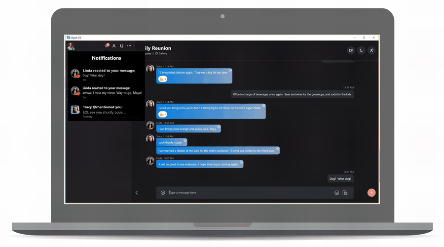 Skype è adesso ancor più cross platform, supportando più dispositivi, tra cui smartphone, desktop, Xbox, e speaker intelligenti. Grazie al cloud i messaggi saranno sempre disponibili ovunque, in qualsiasi app, con un nuovo pannello di notifiche accessibile direttamente nell’angolo destro superiore della propria lista di chat: da qui sarà possibile accedere al proprio pannello di controllo, per vedere le reazioni ai propri messaggi, le menzioni nelle conversazioni di gruppo, o le varie citazioni.