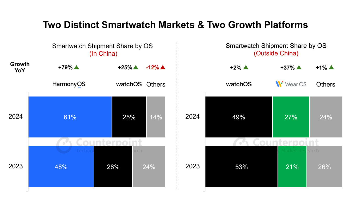 Secondo gli ultimi dati di Counterpoint relativi al monitoraggio degli smartwatch e previsioni che fanno riferimento ad aree geografiche, brand e sistemi operativi, per quanto riguarda i modelli con sistemi HLOS (High-Level Operating System), dopo la crescita piatta del 2023, quest’anno è prevista una crescita del 15% in termini di volumi. Secondo il gruppo di ricerca, una parte importante di questa crescita arriverà da utenti di smartphone non-Apple che adotteranno smartwatch basati su Google Wear all’infuori dalla Cina, e dispositivi HarmonyOS di Huawei per gli smartwatch venduti in Cina.