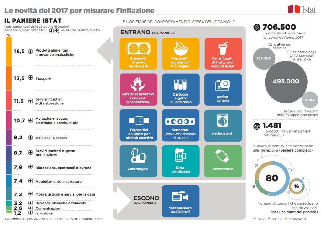 L’aggiornamento dell’annuale paniere Istat, che raccoglie e suddivide le tipologie di spesa delle famiglie italiane in base ai beni acquistati, aggiunge 12 nuovi tipi di prodotto per il 2017, fra cui alcuni prodotti tecnologici di nuova generazione.
