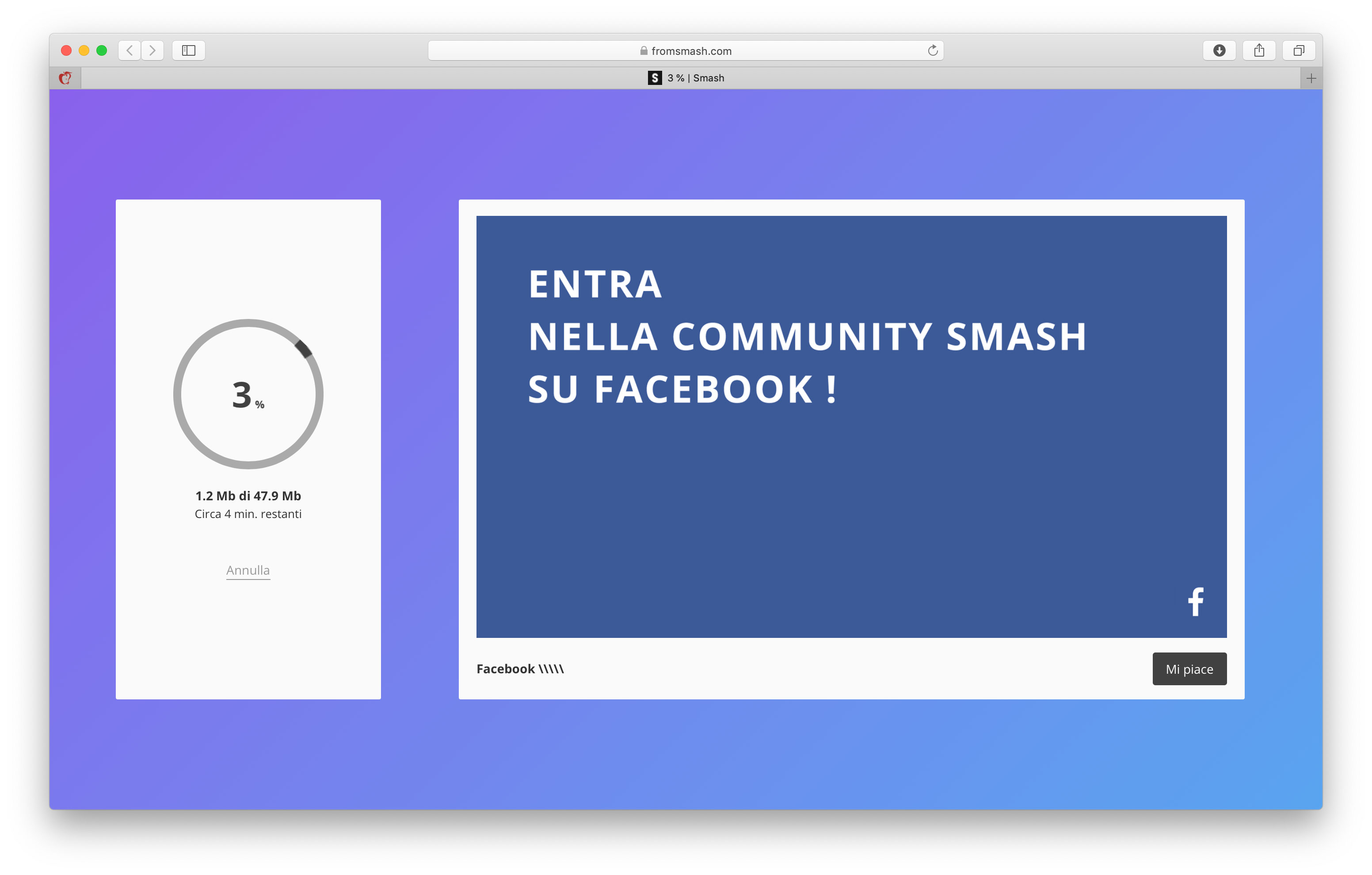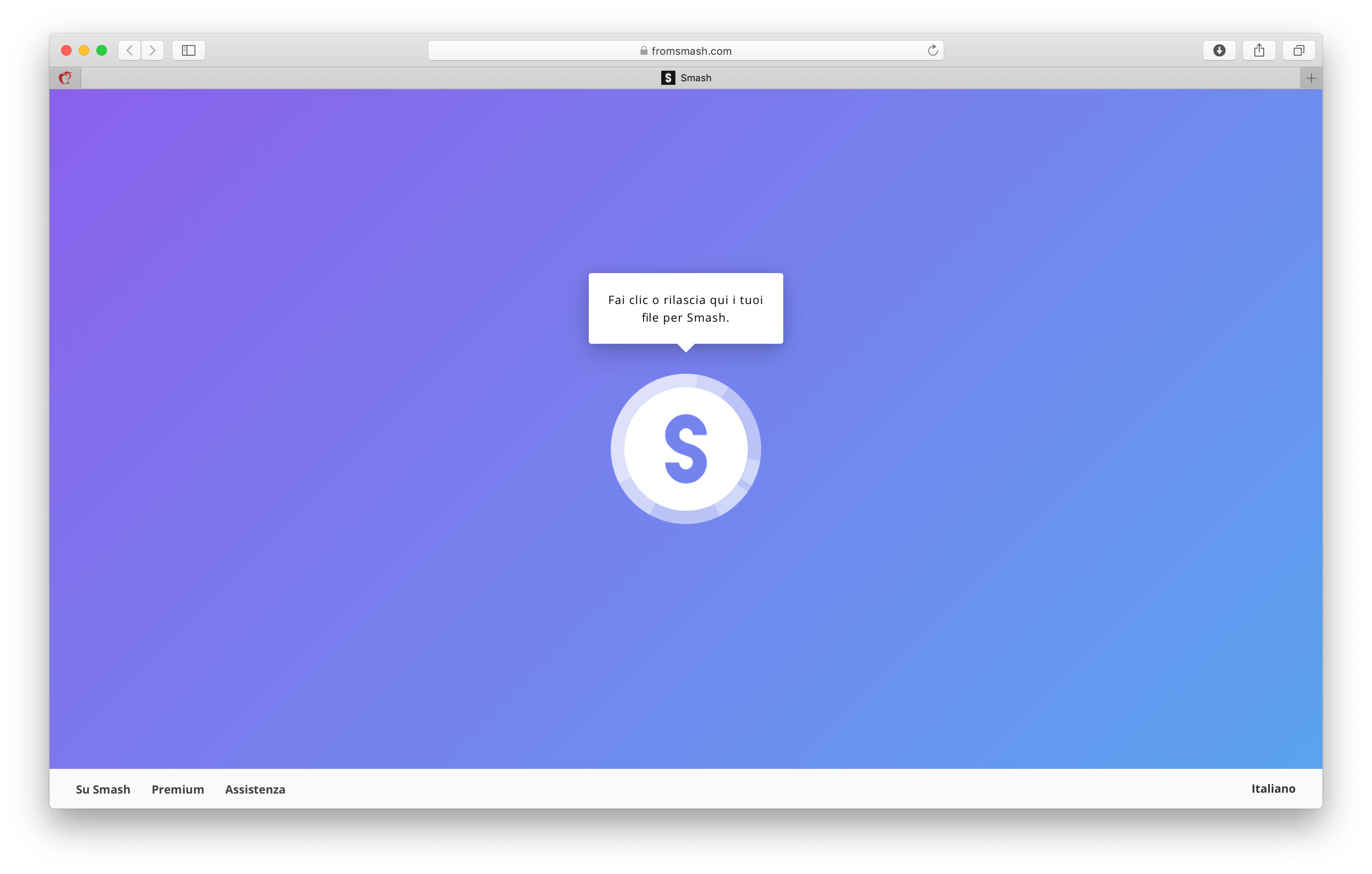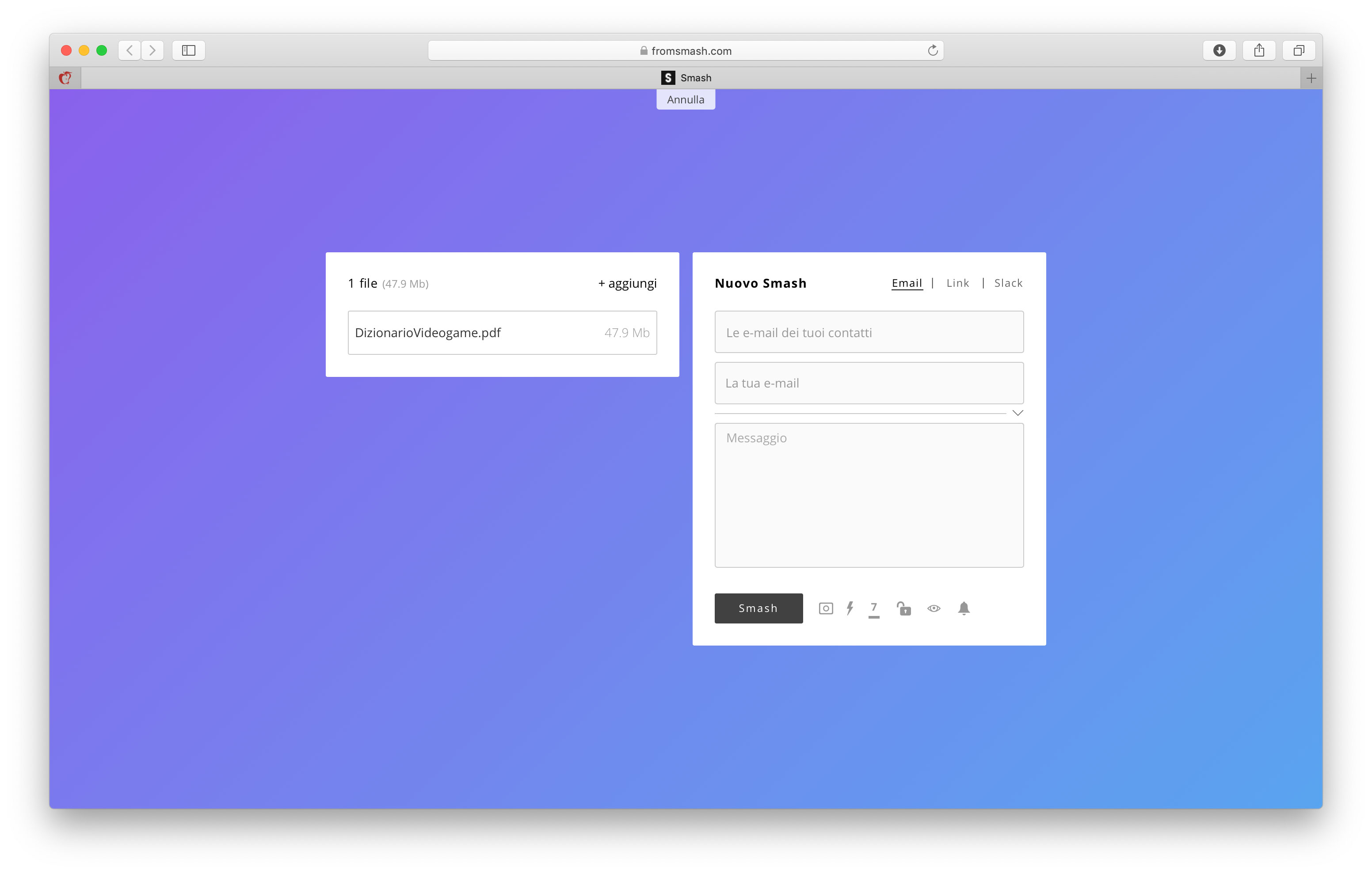 Smash è un servizio web per il trasferimento dei file che consente di inviare documenti di grandi dimensioni specificando semplicemene l’indirizzo mail del destinatario (quest’ultimo riceverà un semplice link), senza limiti nel “peso” dei file.
