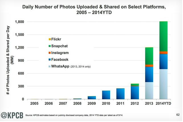 Per paragone, Facebook si attesta attorno ai 300 milioni di immagini condivise al giorno, mentre Instagram probabilmente non raggiunge nemmeno i 100 milioni. Flickr, il social network fotografico più “anziano” non appare nemmeno nel grafico, tanto è ridotto il numero di foto caricate ogni giorno rispetto agli altri network. Si tratta comunque di strumenti diversi: mentre Flickr è più orientato agli appassionati di fotografia (che non caricano qualunque immagine sia a portata di mouse e di tap), Facebook, Whatsapp e Snapchat sono strumenti di comunicazione e le immagini ormai sono entrate in maniera dirompente nella grammatica comunicativa dei social network e vengono utilizzate in moltissimi scambi, anche solo per accompagnare messaggi di testo oppure direttamente nei commenti.