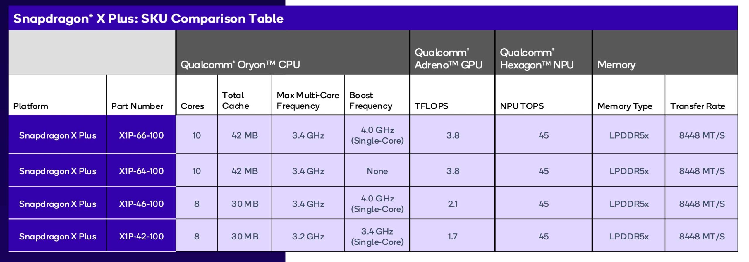 Al lancio dei processori Snapdragon X Series, erano disponibili gli Snapdragon X Elite a 12 core e lo Snapdragon X Plus, limitato a 10 core; la nuova gamma Plus prevede un secondo modello con 10 core e altri due con 8 core, con frequenza operativa fino a 3,2 GHz per carichi multi-thread e fino a 3,4 GHz con carichi single-thread per il modello X1P-42-100. L’unità X1P-46-100 arriverà dopo e per questa il produttore indica supporto frequenze fino a 3,4 GHz nei carichi multi-thread e fino a 4 GHz in single-thread. I core degli ultimi SoC (prodotti a 4nm) integrano 30 MB di cache totale.
