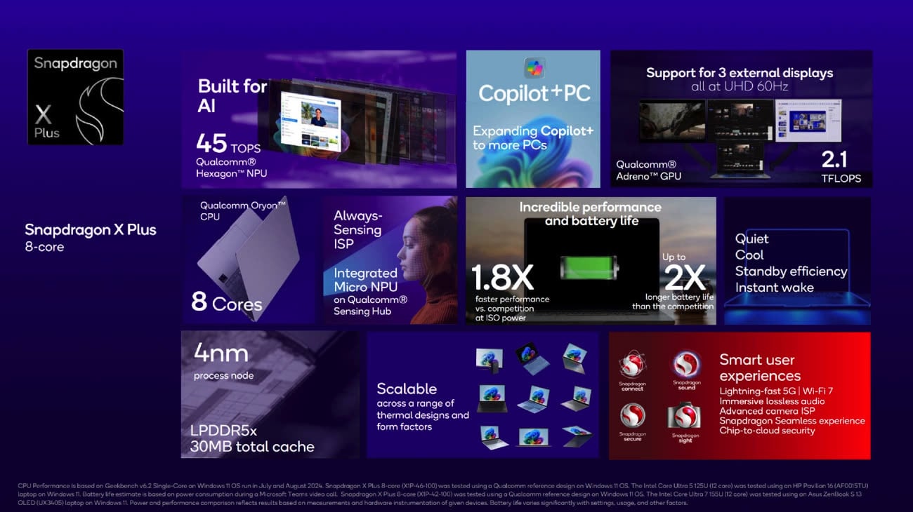 Qualcomm Technologies ha annunciato l’espansione della serie Snapdragon X con la CPU Snapdragon X Plus 8-core, piattaforma che (grazie alla riduzione dei core passando da 12 a 8 core) permette agli OEM di offrire Copilot+PC più economici rispetto agli attuali. I componenti legati alla CPU continuano a vantare performance di buon livello; si ha una riduzione delle prestazioni, invece, sul versante GPU.