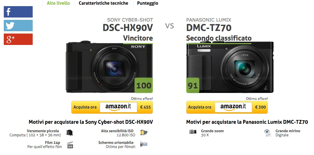 E’ sufficiente scegliere i due modelli da confrontare per il risultato finale ottenendo un riassunto delle caratteristiche vincenti ed un punteggio complessivo per la categoria. Oltre al confronto con i due modelli prescelti, il sito estrae anche fotocamere dalle caratteristiche simili ed mette in evidenza le caratteristiche tecniche e i vantaggi o gli svantaggi anche per un eventuale “terzo incomodo”, consentendo di ottenere una panoramica più ampia.