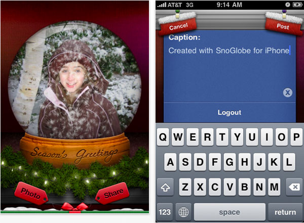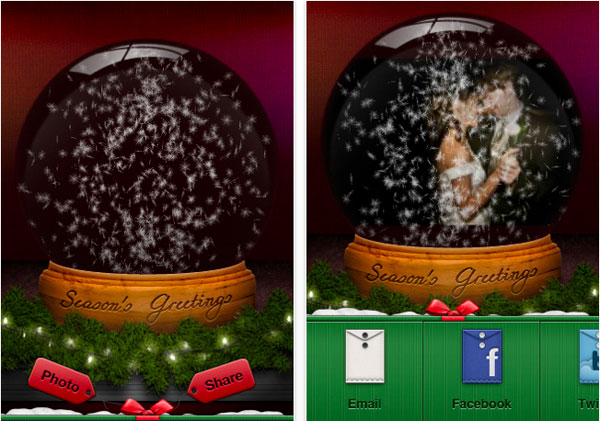 Tra gli addobbi natalizi tradizionali non può mancare la sfera di vetro con paesaggio imbiancato e la neve: l’applicativo SnoGlobe offre una ricostruzione digitale sfruttando le funzionalità  di iPhone e touch. Oltre a rispondere alla fisica che simula il comportamento reale dei fiocchi, inclusa la forza di gravità , la neve digitale segue gli spostamenti rilevati dall’accelerometro integrato. Nella nostra sfera possiamo inserire fotografie dal Rullino Fotografico e immagini scattate al volo con iPhone, infine effettuare un fermo immagine per condividere la sfera con i nostri contatti tramite email, Facebook e anche Twitter.