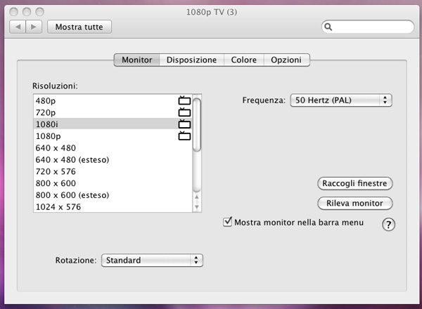 La novità di Snow Leopard è che Apple ha finalmente deciso di inserire nel supporto alle risoluzioni video anche la modalità interlacciata: in questo modo il TV che senza mentire si dichiarava “Full HD” ma non specificava di non disporre di una risoluzione 1080 progressiva è diventato un mostro di bellezza, basta selezionare “1080i” tra le risoluzioni disponibili e finalmente viene agganciata la massima risoluzione “nativa” del pannello.