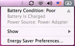 Oltre alla carica residua indicata da qualsiasi sistema operativo, Snow Leopard tiene costantemente sotto controllo lo stato complessivo della batteria dei notebook della Mela avvisando l’utente quando il ciclo di vita dell’accumulatore sta per finire. Con un clic sull’indicatore della carica residua nell’angolo in alto a destra del desktop del Mac viene visualizzata la tradizionale finestra di Mac OS X dedicata alla batteria: secondo una immagine che sta circolando sul Web, in Snow Leopard viene visualizzato un messaggio supplementare. Nella prima riga della finestra è visualizzata la scritta “Battery Condition:” seguito poi dallo stato complessivo della batteria riassunto in un solo aggettivo. Nella schermata disponibile su Internet appare la scritta “Poor” segnalando così all’utente che è giunto il momento di sostituire l’accumulatore.