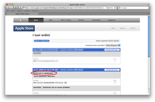La terza segnalazione giunge da un nostro lettore che aveva ordinato proprio l’aggiornamento a Snow Leopard attraverso il programma Up To Date riservato a chi ha comprato un Mac nelle passate settimane il cui pannello dello stato di consegna riporta ora (come si vede nella immagine in calce a questo articolo) la dicitura “pronto per la spedizione”. La data di invio resta però fissata a settembre.