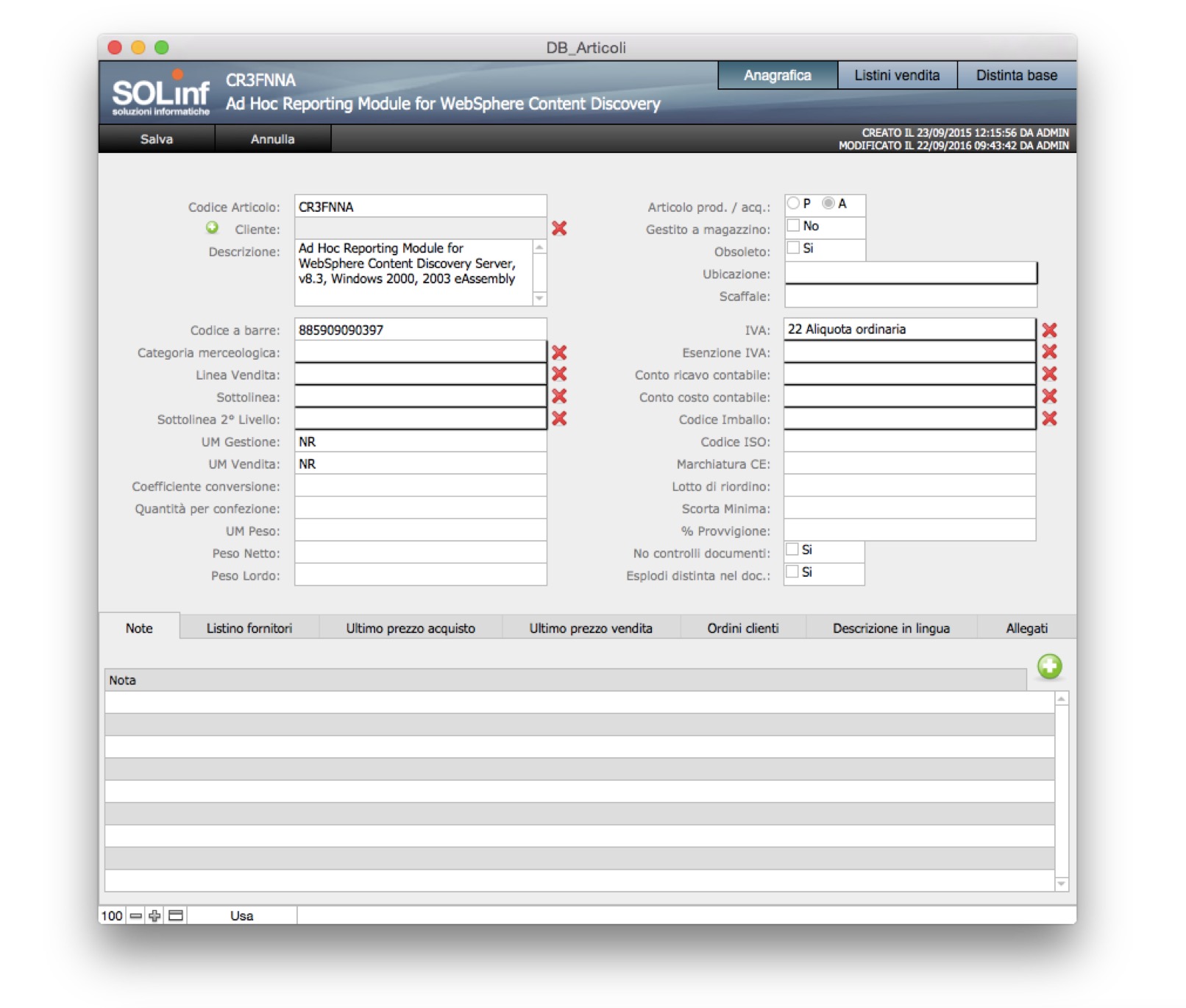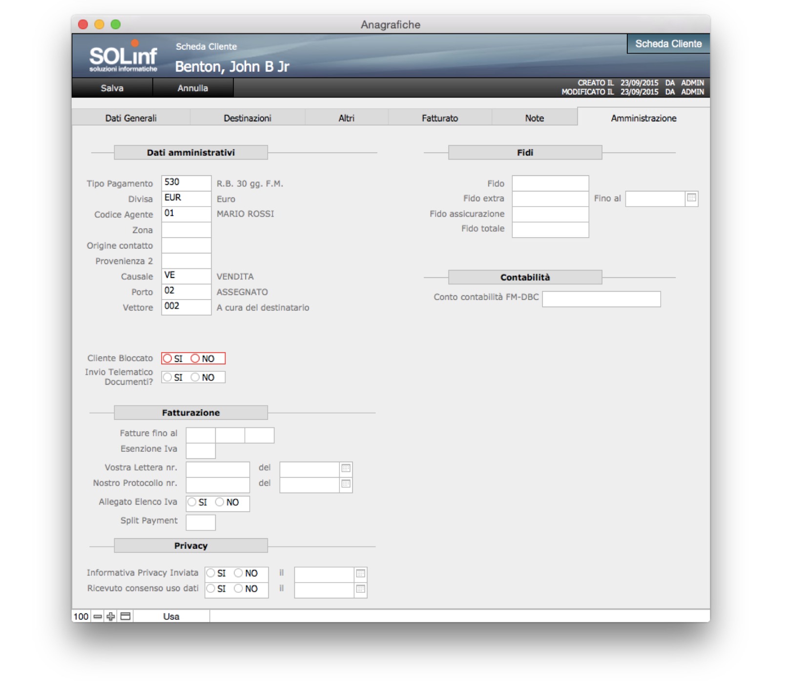 – Anagrafiche clienti e fornitori, contatti, destinazioni, note di credito