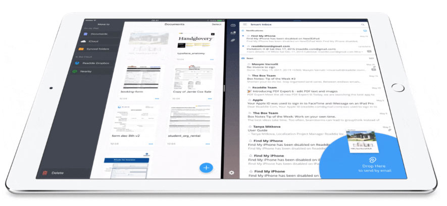 Sull’attuale versione di iOS non è supportato nativamente il drag&drop di elementi tra app diverse ma gli sviluppatori di Readdle hanno integrato nelle nuove versioni delle loro app, tecnologie specifiche per PDF Expert, Spark e Scanner Pro, sfruttando comode funzionalità che tengono conto di funzioni per il multitasking come Split Screen di iOS 10.