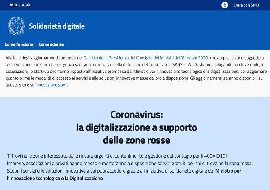 Imprese, associazioni e privati hanno messo e metteranno a disposizione servizi gratuiti per chi si trova nelle zone rosse in Italia per l’epidemia coronavirus: è questo in sintesi Solidarietà digitale, l’iniziativa che il Ministero per l’innovazione tecnologica e la Digitalizzazione ha voluto a supporto delle zone interessate dai provvedimenti più restrittivi per il contenimento del Coronavirus.