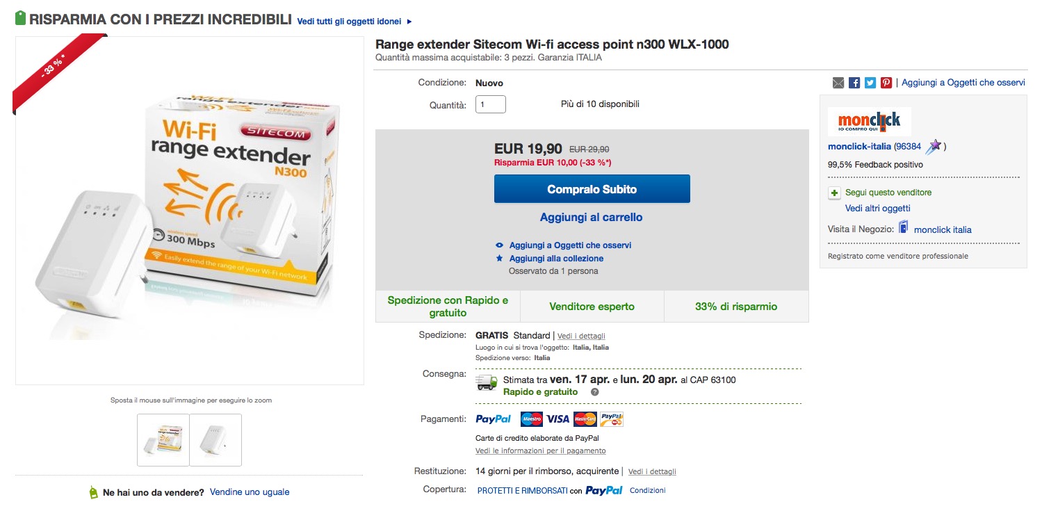 Se state cercando un range extender a 300 Mbps, la migliore offerta è attualmente disponibile su Ebay. Il Sitecom Wi-fi access point n300 WLX-1000 costa, infatti, 19,90 euro, uno sconto che lo porta in prima posizione nella classifica dei range extender più economici di uguali caratteristiche.