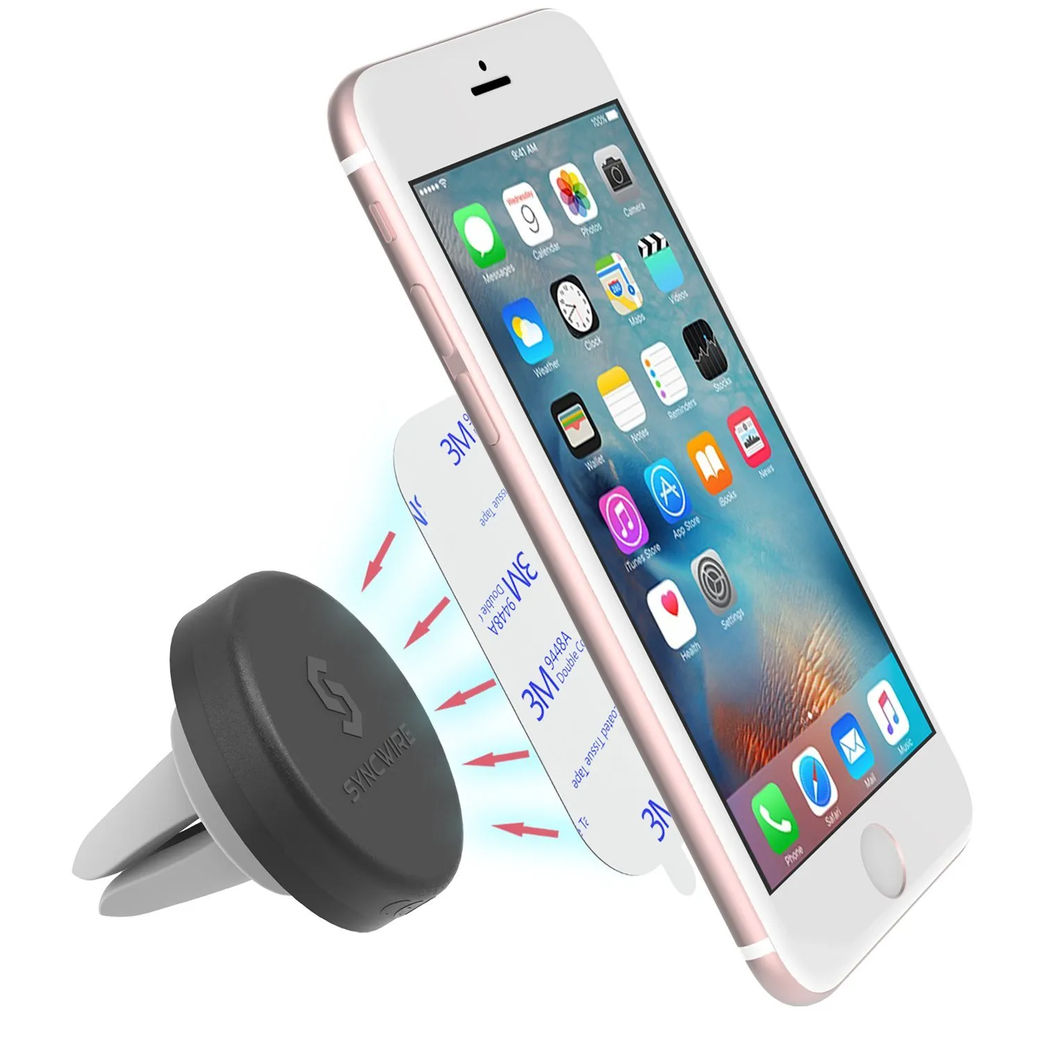 È una semplice ma potente calamita che si fissa alla bocchetta dell’auto ed aggancia magneticamente lo smartphone al cui retro va fissata una sottile piastra di metallo (si può anche semplicemente infilare tra il telefono e la custodia).