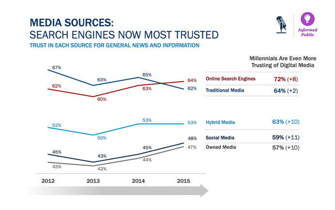 In base alle ultime rilevazioni già datate 2015, i motori di ricerca hanno superato i media tradizionali, fermi al 62 per cento, raggiungendo il 64 per cento in termini di autorevolezza e fiducia. Al terzo posto arrivano i “media ibridi”, definiti come canali digitali che solitamente tendono ad aggregare anche fonti tradizionali, come ad esempio come FlipBoard o TechMeme, ossia molti dei più popolari aggregatori di news, al 53 per cento. Seguono poi i social network e i media di proprietà, rispettivamente al 48 e 47 per cento.