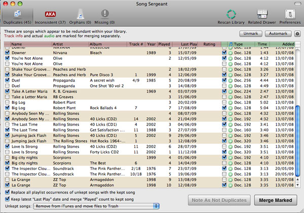 Nella versione dimostrativa gratuita Song Sergeant individua in automatico tutti i nomi errati e che generano duplicati nel nostro archivio iTunes per singoli brani, per gli album e anche per gli artisti. Se tra le cartelle di iTunes il software individua dei brani orfani, vale a dire memorizzati nel computer ma non più raggiungibili, vengono segnalati all’utente. Mentre la versione dimostrativa rileva i problemi, per risolverli in automatico occorre una copia registrata di Song Sergeant proposta a 20 dollari, circa 14 euro. Nella risoluzione automatica dei problemi Song Sergeant lavora in modo intelligente: nel caso di duplicati di brani o artisti individua non solo il nome corretto ma è in grado di raccogliere tutti i migliori dati disponibili per eliminare i duplicati. Così tra più copie di una canzone Song Sergeant conserva la traccia audio di qualità migliore, unendo a questa le informazioni più dettagliate e corrette associate ad un altro duplicato che poi verrà scartato. Per provare Song Sergeant e per acquistare la versione completa rimandiamo a questa pagina dello sviluppatore.