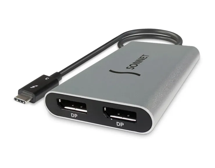 Sonnet ha presentato un adattatore da Thunderbolt 3 a Dual DisplayPort compatibile con Mac e PC. È un accessorio compatto (59 x 99 x 16 mm) che si alimenta dal bus e permette di collegare fino a due monitor 4K ultra-high-definition (UHD) DisplayPort (DP) o un monitor DP 5K a una singola porta Thunderbolt 3 del computer.