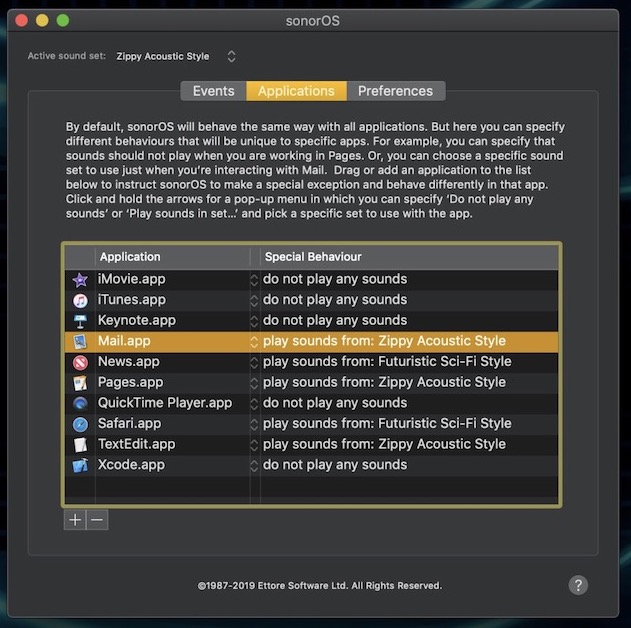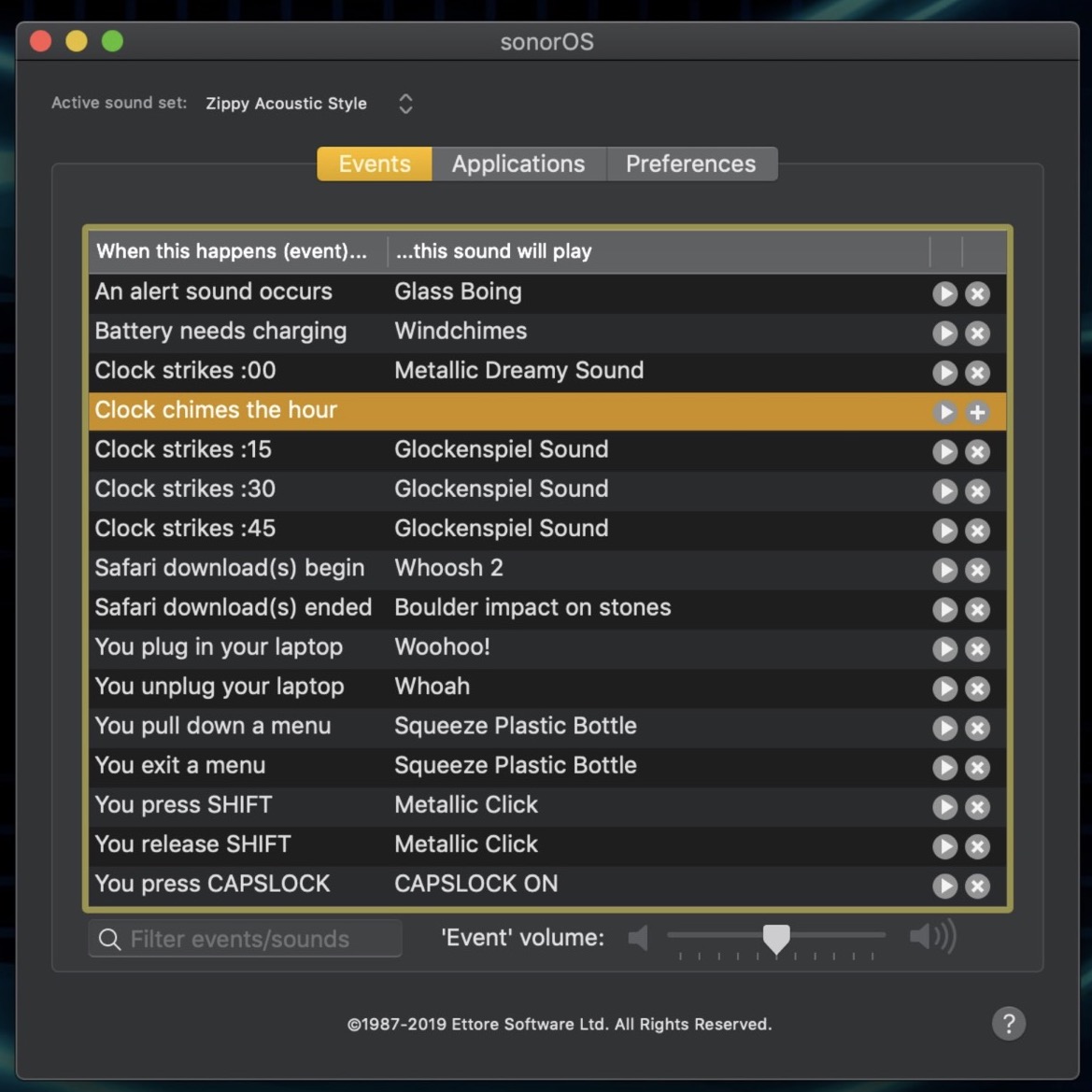 Con sonorOS è possibile assegnare suoni fino a 36 eventi di sistema macOS più comuni. Sarà sufficiente selezionare il file audio .m4a, .mp3, .wav o .aif scelto ed associarlo ad un evento in sonorOS.