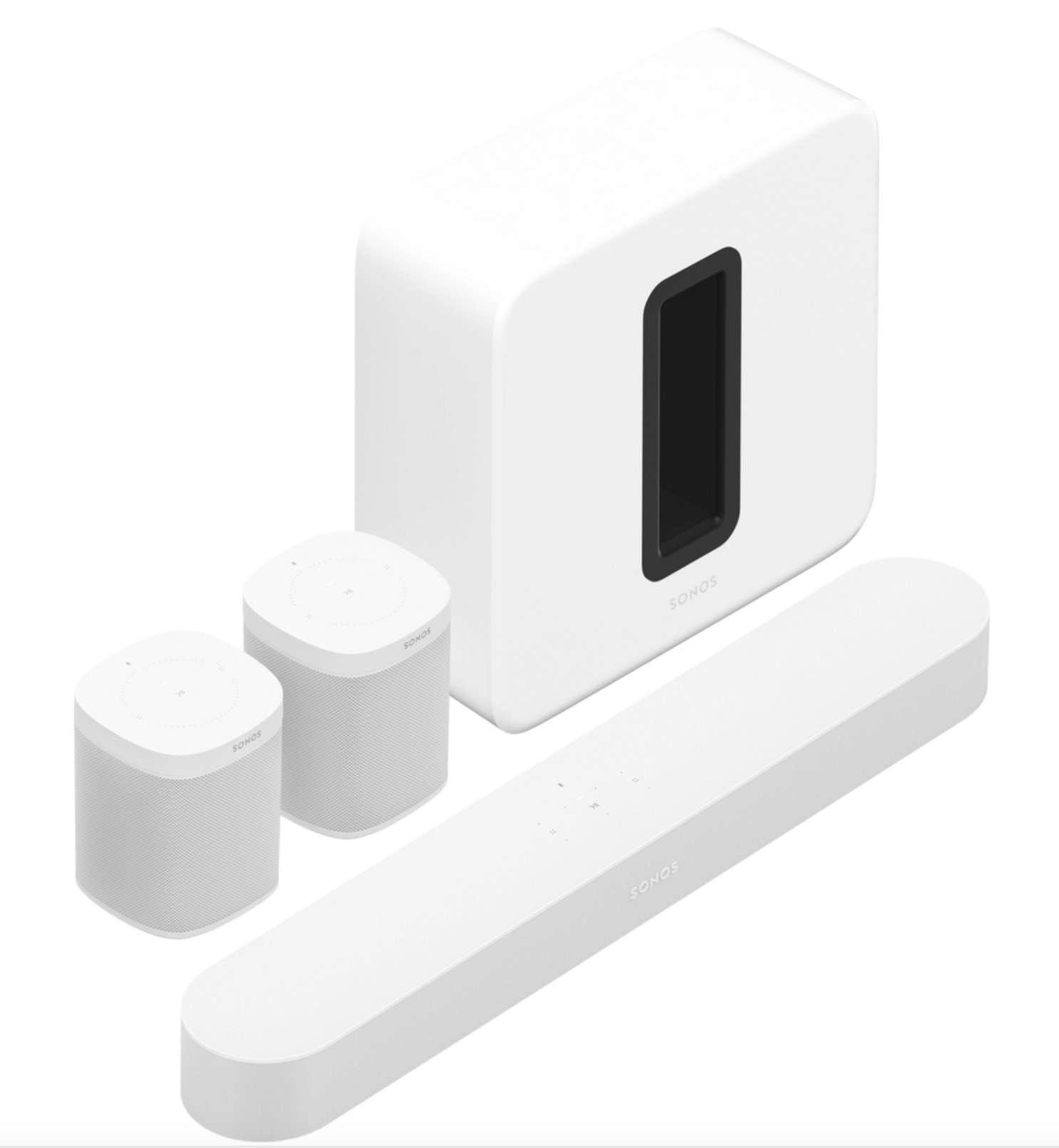 Nell’immagine qui sotto una configurazione Surround con Dolby Atmos di Beam GEN 2, SUB 3 GEN e Sonos One SL. Il costo totale è di 1.806 € con il Sub che è di gran lunga la componente più importante dal punto di vista del prezzo e dell’ingombro.