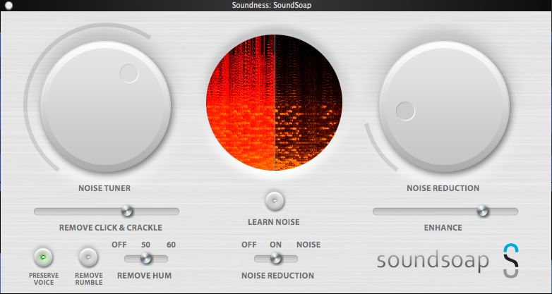 SoundSoap è una utility specificatamente pensata la riduzione del rumore dai file audio e video, molto usata in campo professionale per la riduzione del rumore e la pulizia del suono. Tra le peculiarità del programma, l’Adaptive Noise Reduction, un algoritmo che permette di estrarre il profilo del rumore da aree, con modalità impossibili con altri applicativi. Sezioni specifiche permettono di rimuovere o ridurre particolari tipologie di rumori. Il controllo “Noise Tuner” permette di individuare la frequenza corretta da eliminare e il pulsante “Learn Noise” regola automaticamente il controllo. L’opzione “Remove Rumbe” permette, invece, di eliminare qualunque rumore fastidioso sotto una particolare soglia (esempio: 40hz).
