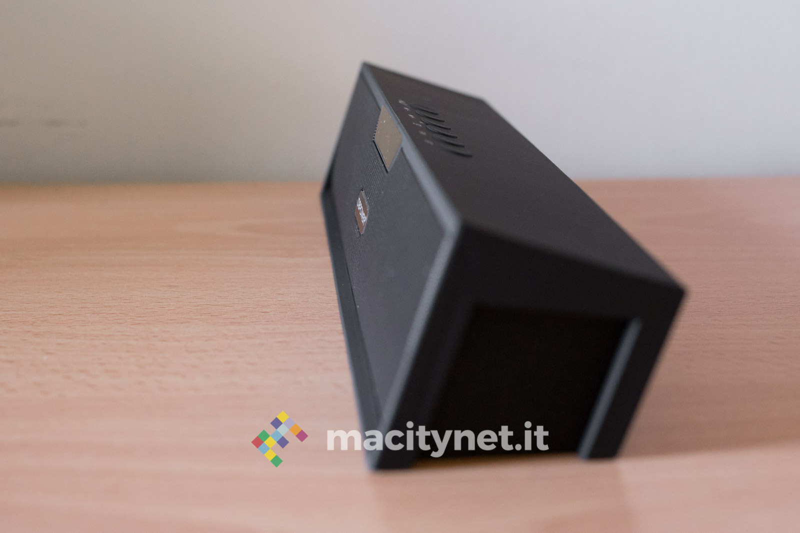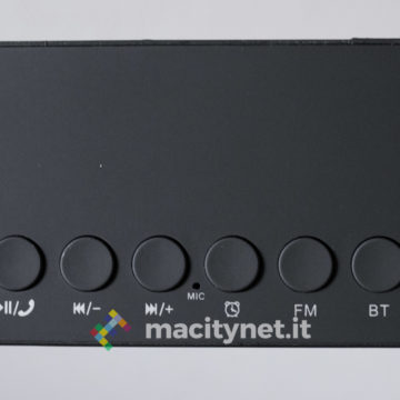 E’ particolarmente interessante anche l’utilizzo come sveglia: se si attiva la modalità orologio la cassa va in una sorta di Standby, mostrando semplicemente l’ora sul piccolo display LCD incassato frontalmente. Programmare la sveglia è un attimo e all’ora indicata la cassa emetterà un forte segnale acustico che, tra un bip e l’altro, potrà essere arrestato soltanto premendo uno dei pulsanti presenti sulla cassa.