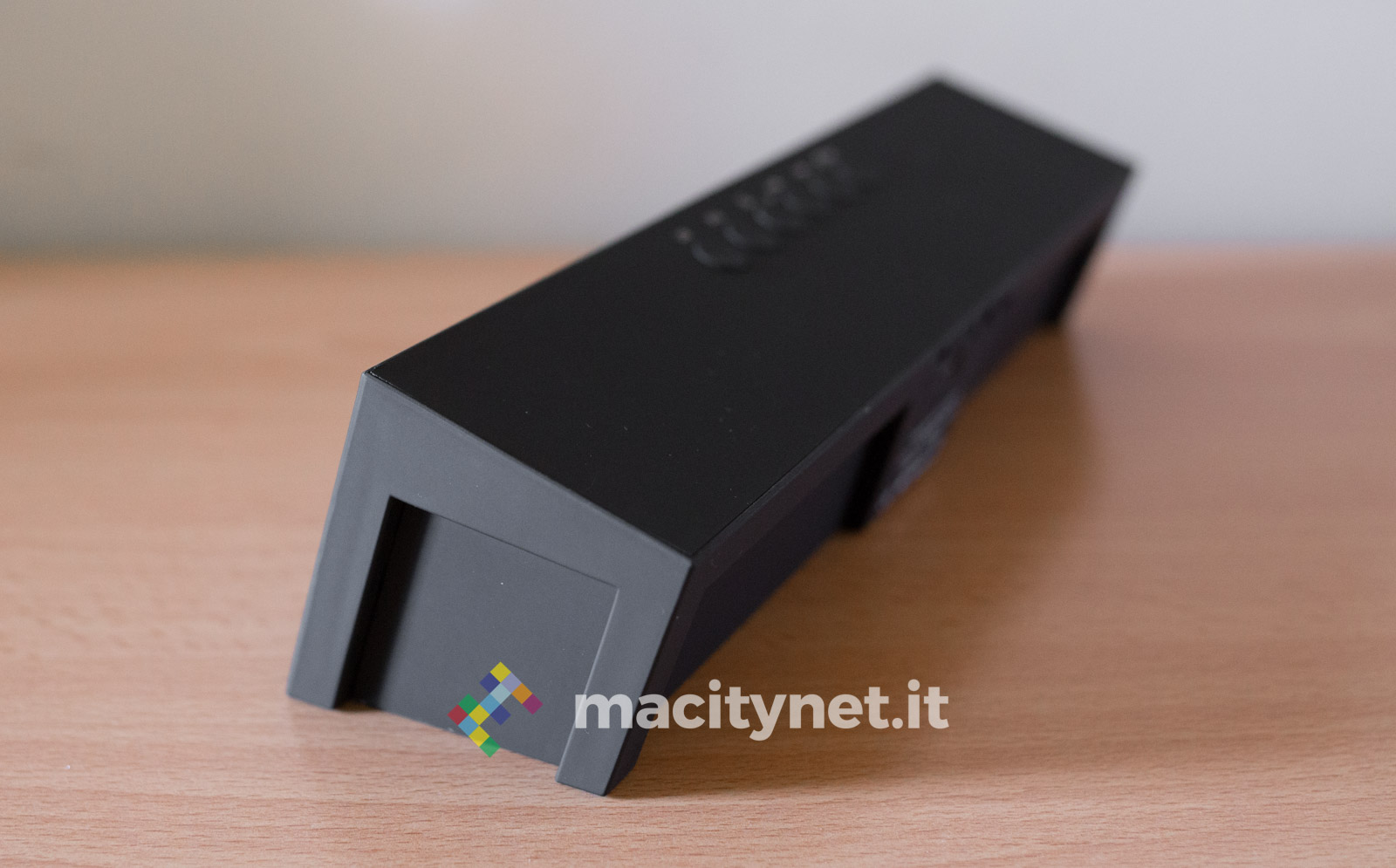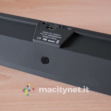 Come dicevamo, questo altoparlante è esteticamente simile a una soundbar. Metro alla mano, è lungo precisamente 24 centimetri e spesso 5 centimetri, mentre l’altezza è di 4 centimetri dietro e 6,5 centimetri nella parte frontale, il che rende la cassa leggermente obliqua per direzionare gli speaker leggermente verso l’alto.