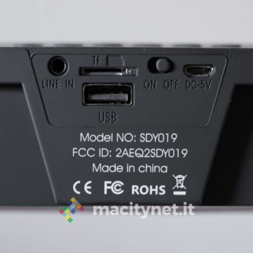 DBPower SDY019 è uno speaker Bluetooth un po’ diverso dai soliti, sia per la forma allungata, sia per le funzioni offerte. E’ anche una sveglia, ha la radio e legge la musica anche da supporti esterni, per una possibilità d’uso praticamente illimitata. L’autonomia è molto buona (siamo intorno alle 5 ore di riproduzione continuata al massimo del volume) e la possibilità di utilizzarla anche per rispondere a una telefonata in vivavoce lo rendono un accessorio davvero completo.