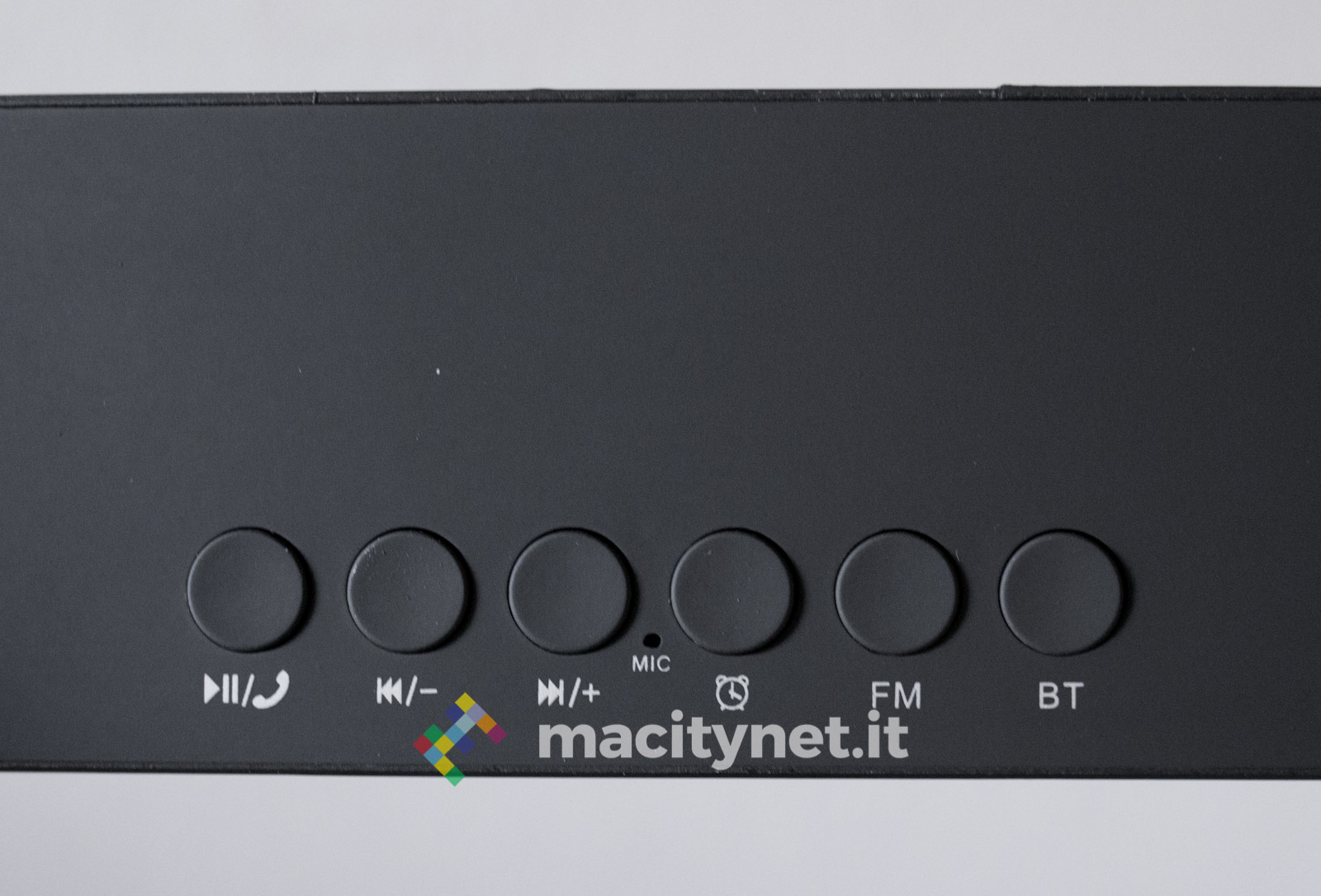 I controlli sono posizionati sul bordo superiore. Sono 6 pulsanti di forma circolare che permetto di (da sinistra verso destra): avviare/fermare la riproduzione musicale o rispondere a una telefonata in entrata, regolare il volume (con la pressione prolungata) o saltare le tracce (con il singolo click), gestire la sezione sveglia, accedere alla radio e attivare il Bluetooth.